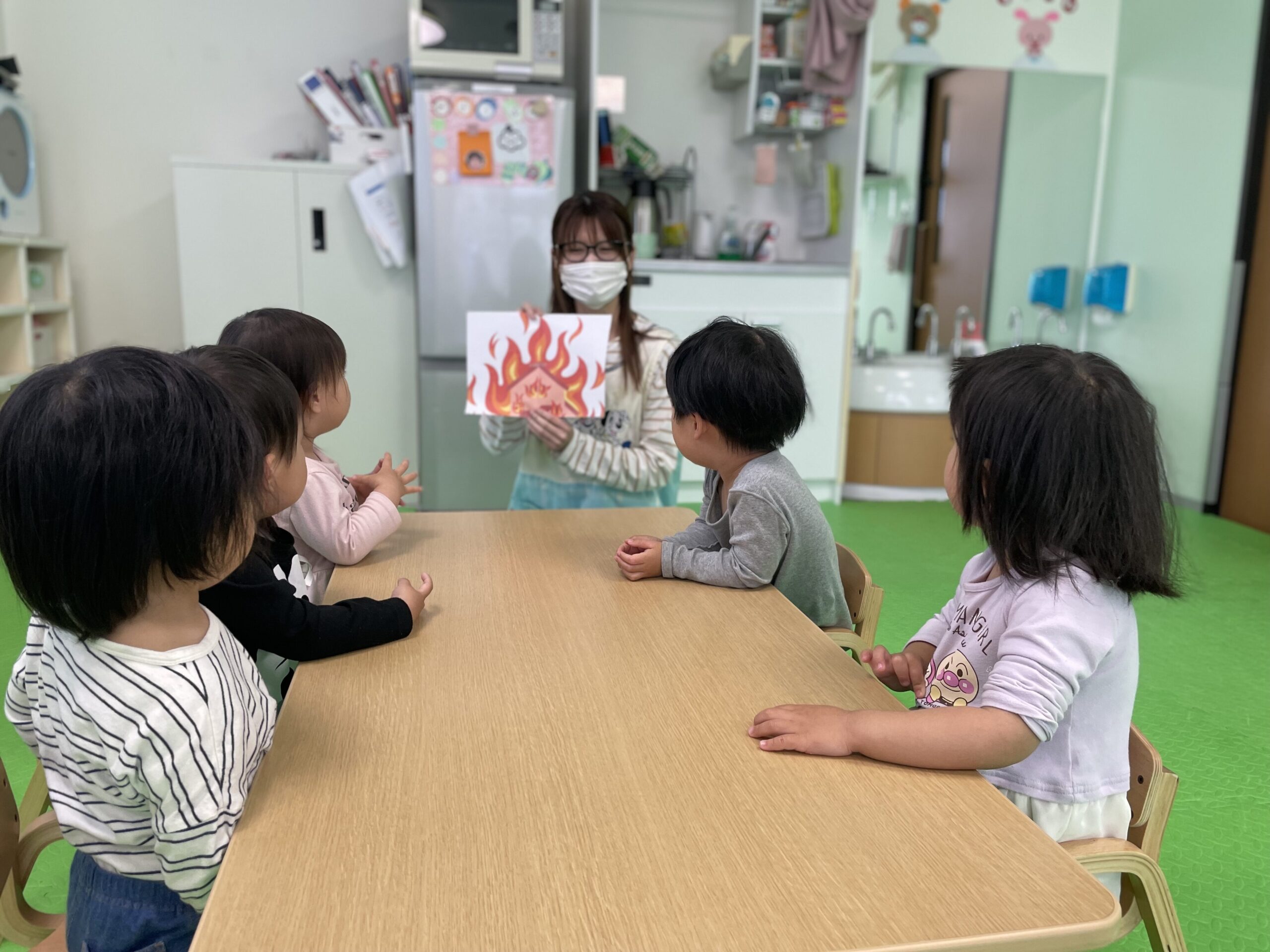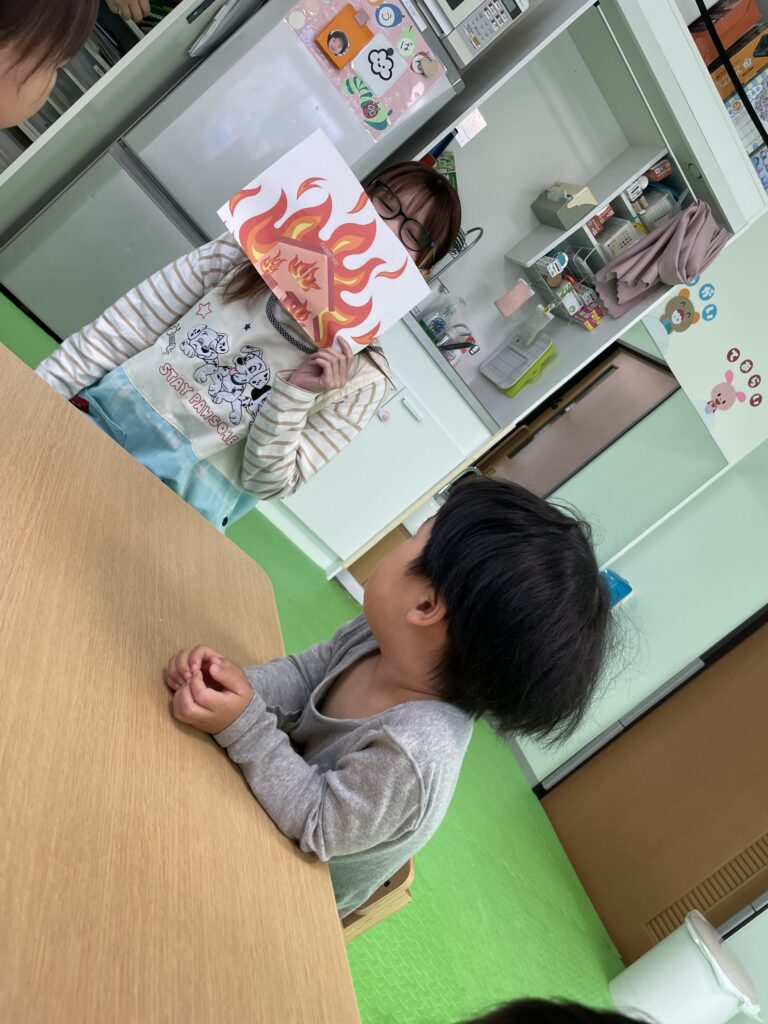 まずは、火災はどんな物か、火災が起きたらどうやって逃げるのかなどのお話をしました。