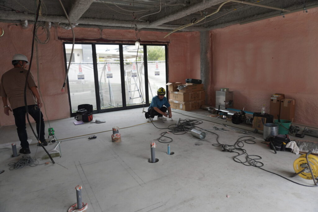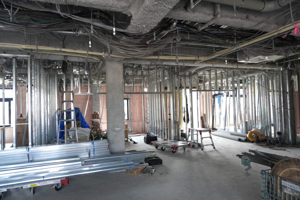 内装の1階は、壁や天井の下地として使用されるLGS(軽量鉄骨)が組み立て途中で、