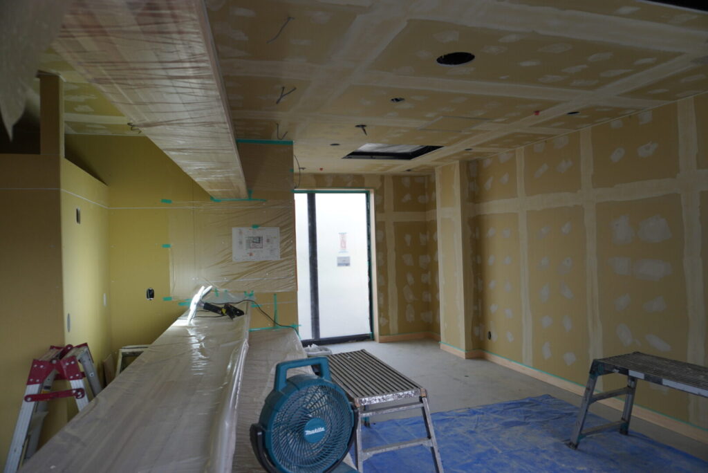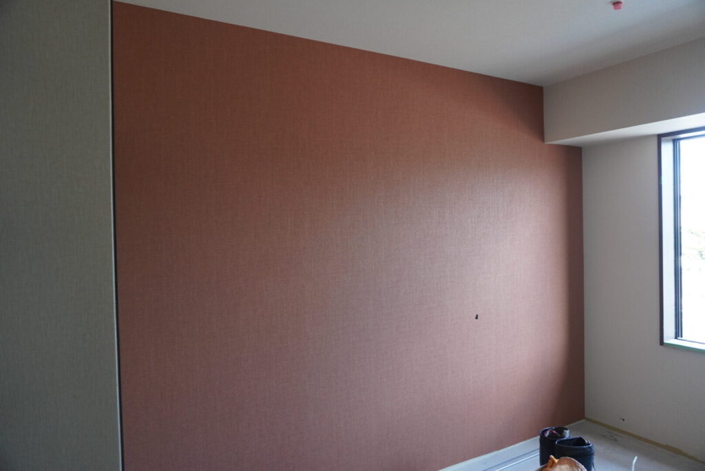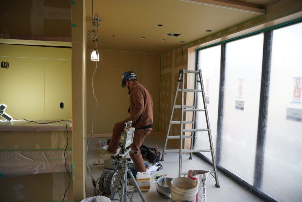 居室のある2・3階は、組み立てられた後で壁紙を貼るためのボードが設置されていました。設置されたボード同士には、溝があるためそこを埋めていき壁張り作業へと移ります。