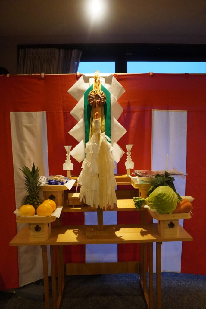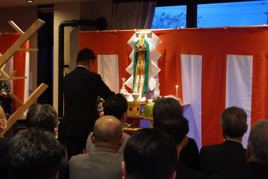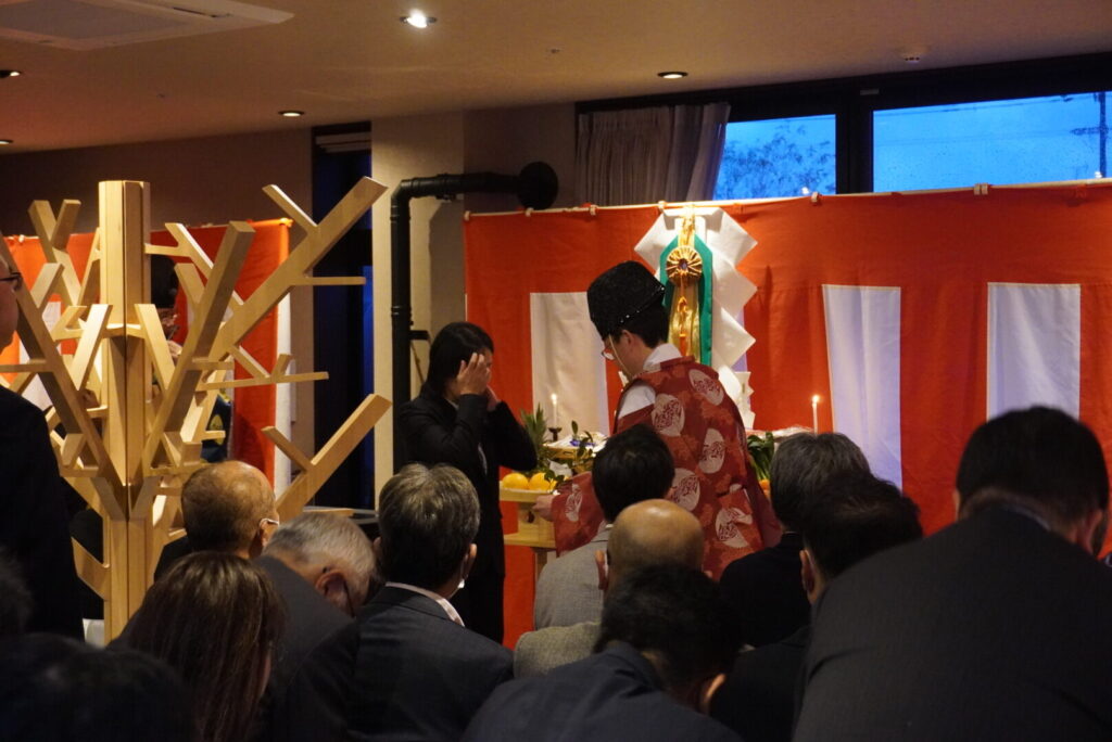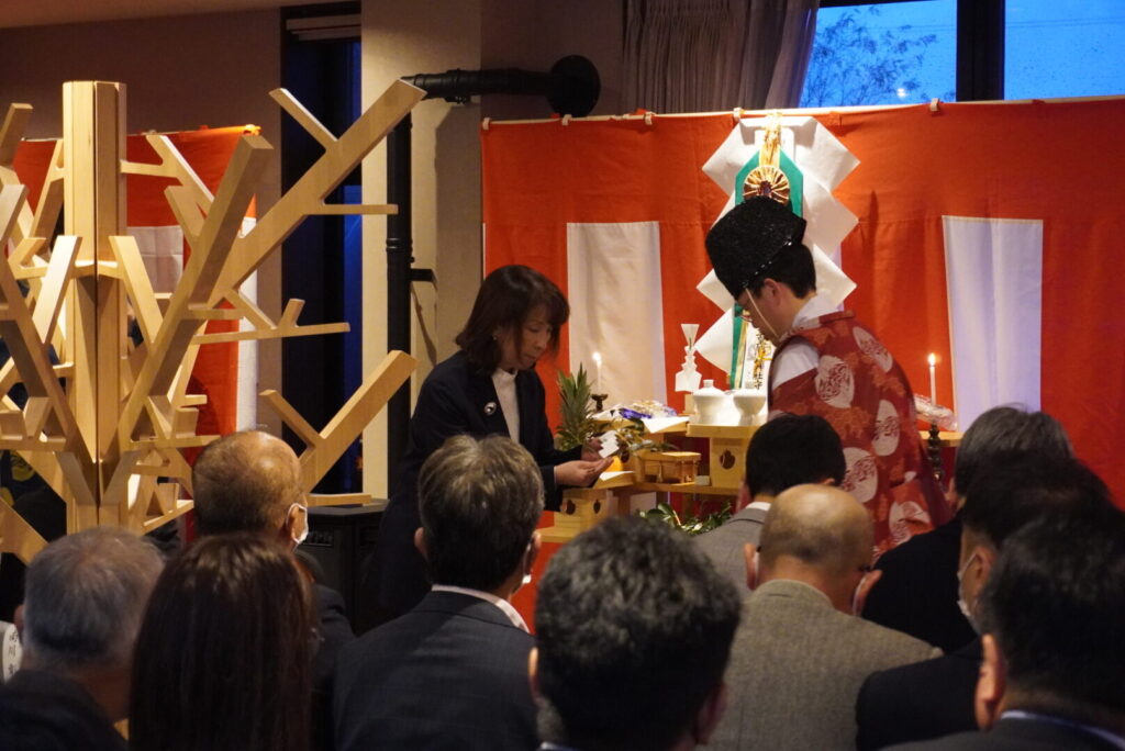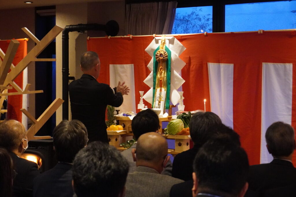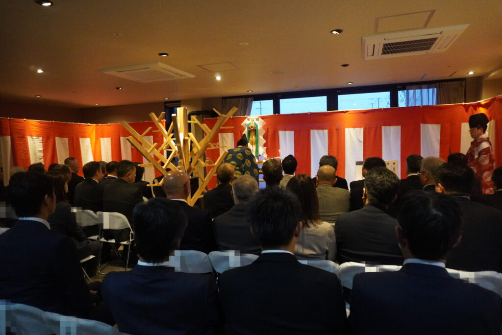 まずは、神主様から建物が無事完成したことを奉告し、着工以来の神助、加護を感謝するとともに新しい建物の永遠の堅固安全と施主の弥栄を祈願します。