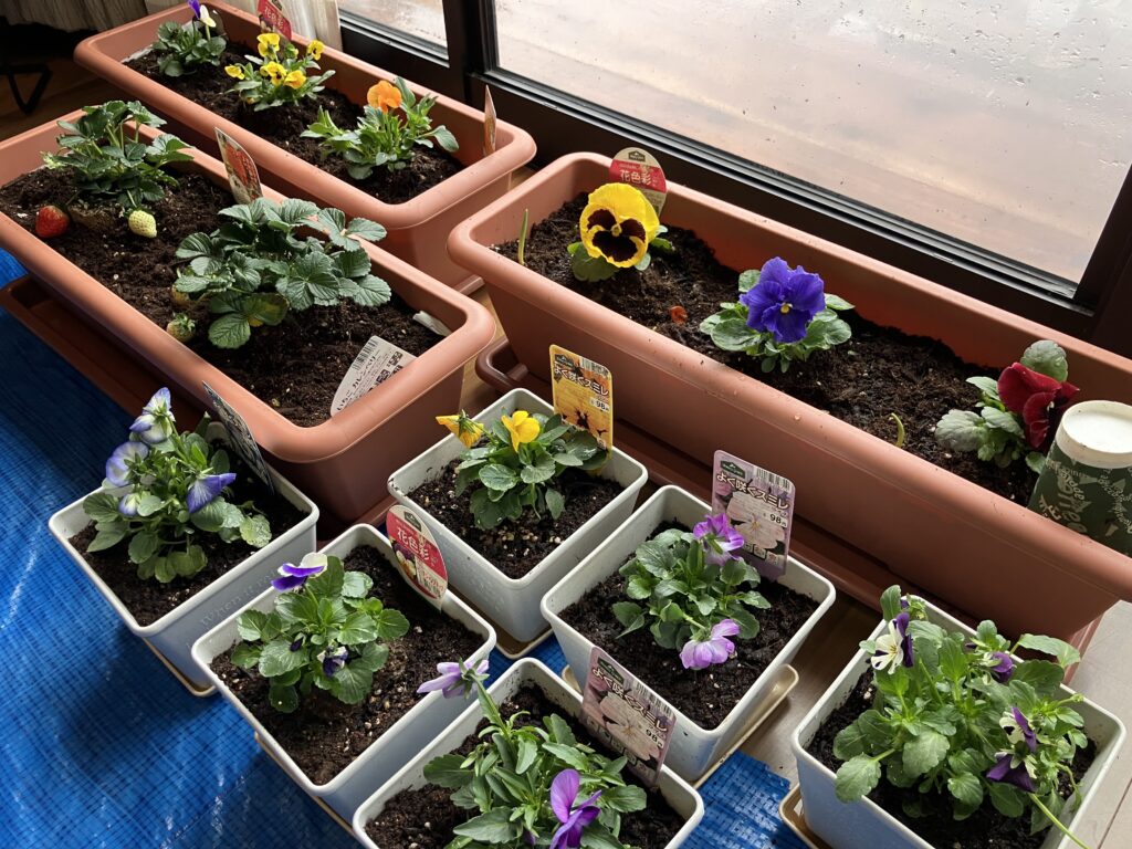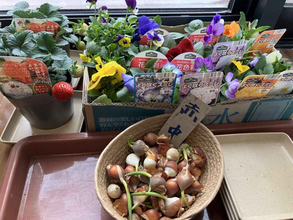 用意したお花は、スミレ、ビオラ、パンジー、いちごの苗とチューリップの球根です!