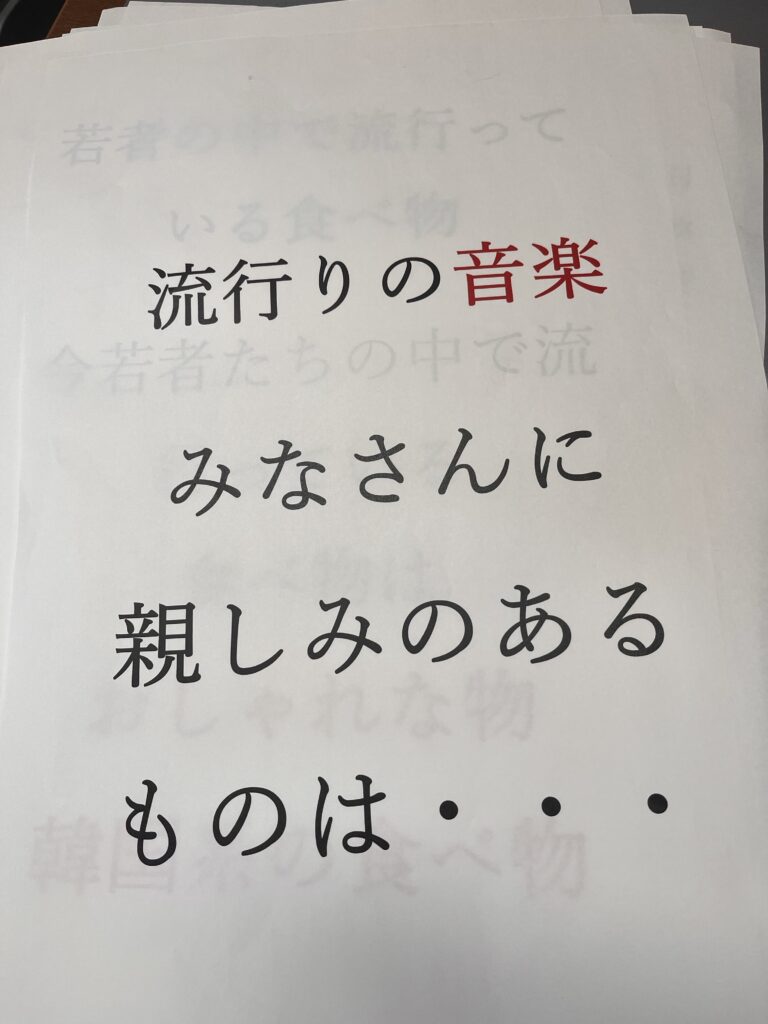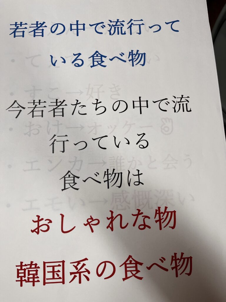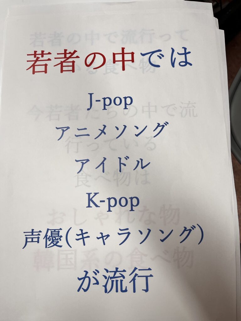 そんなZ世代について今日は言葉(若者言葉、略語)、流行りの食べ物、流行りに音楽の3つのジャンルに分けて学んでいただきました。