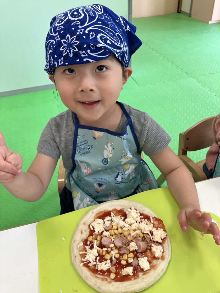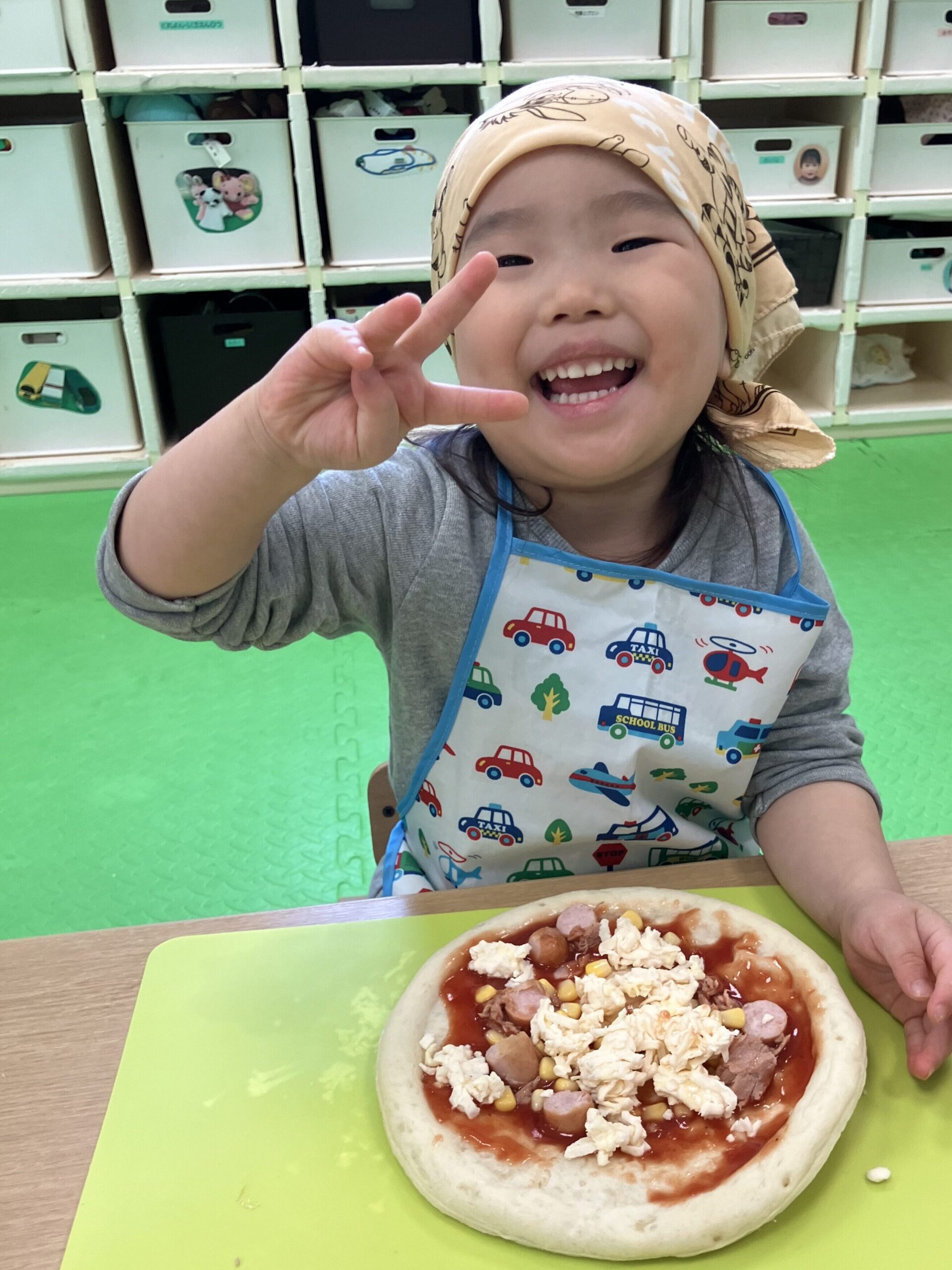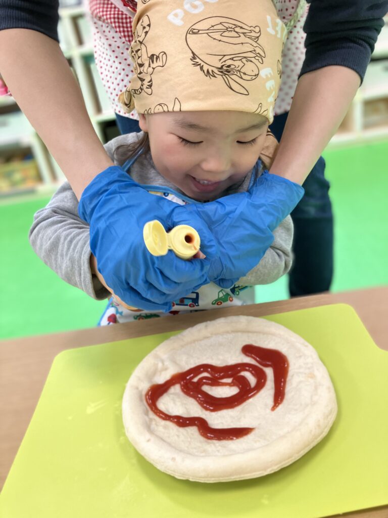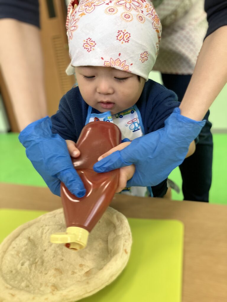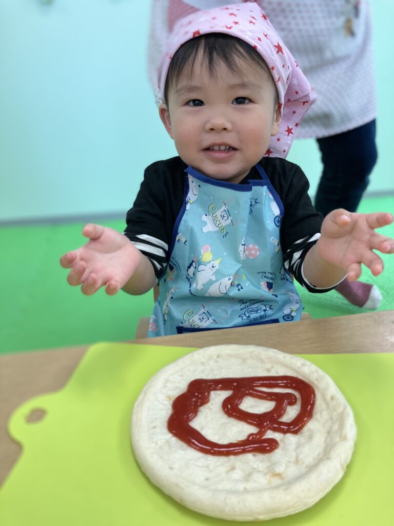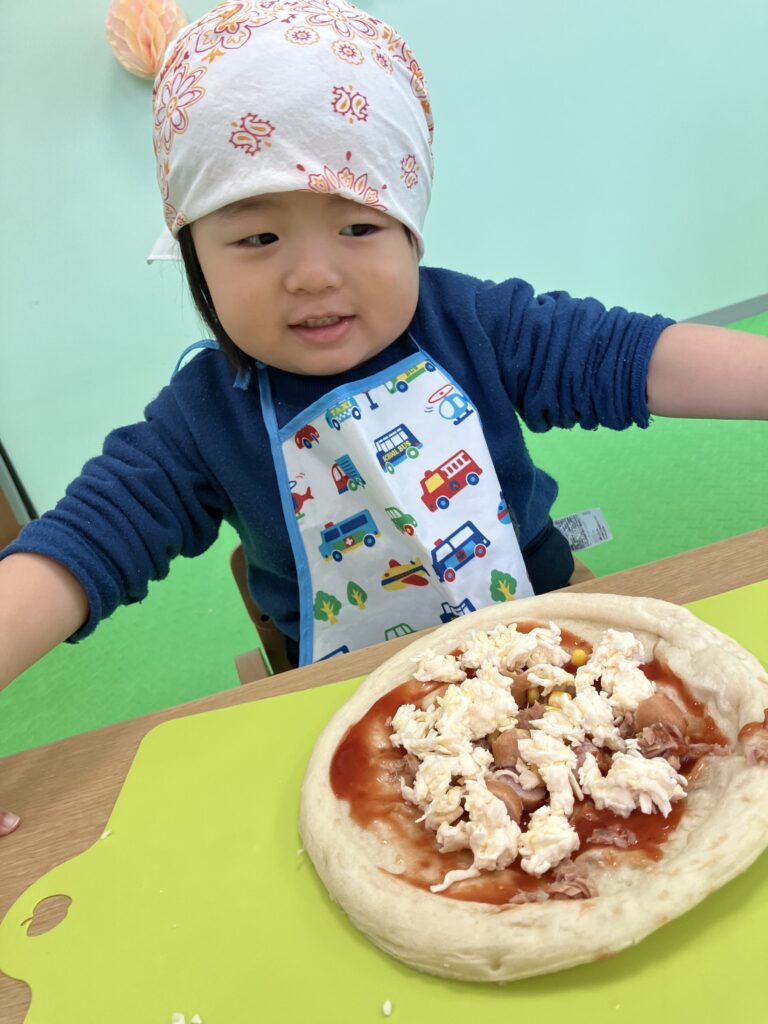 先日、子どもたちと制作ピザ作りをしたので子供達もイメージが付いていてスムーズに作ることができました。