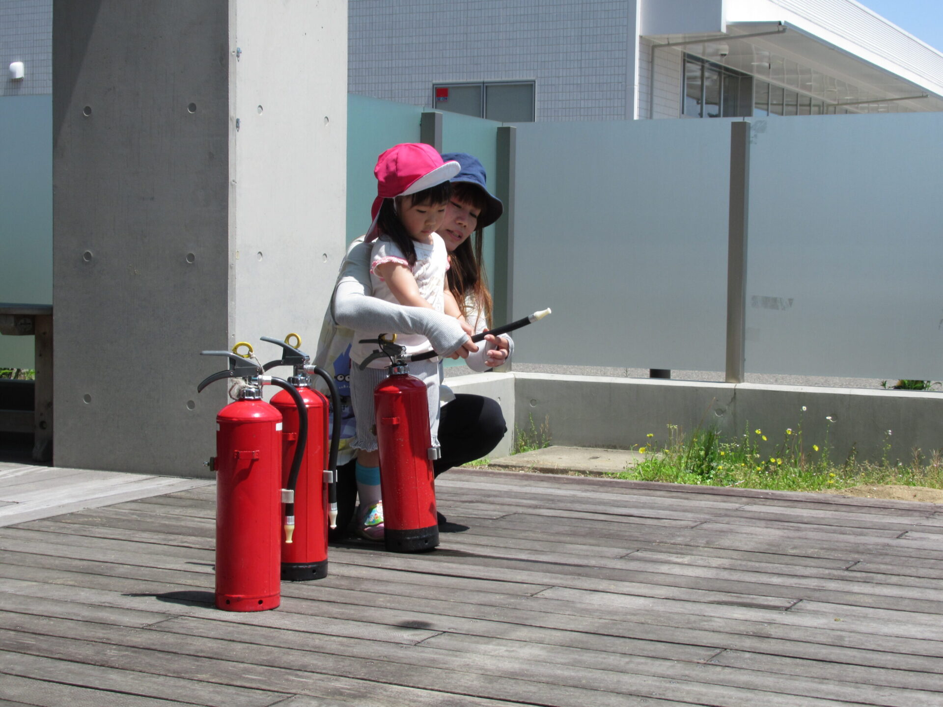 保育士と一緒に消火器を持って、消火をしました。