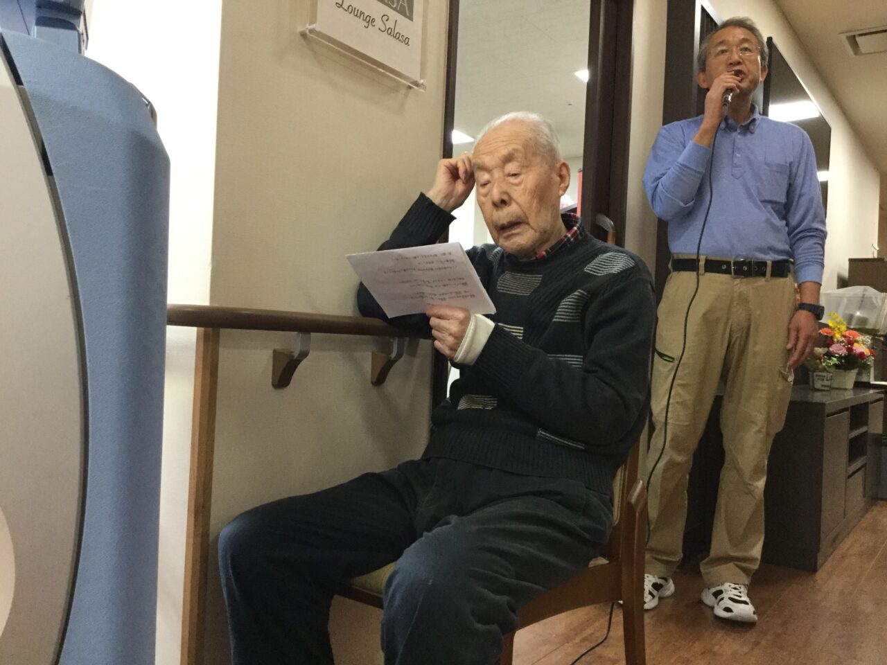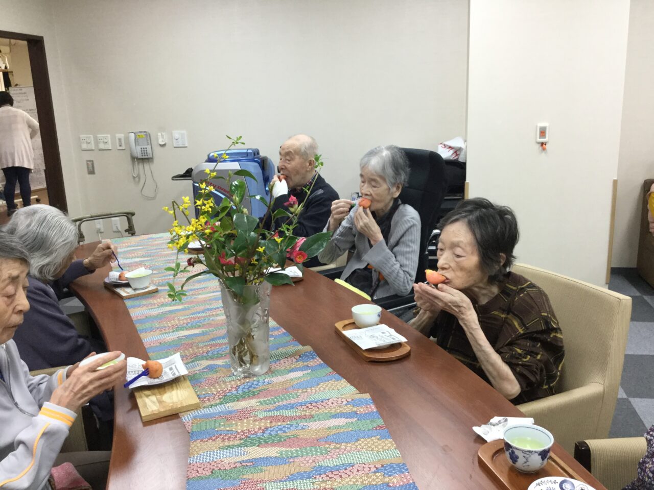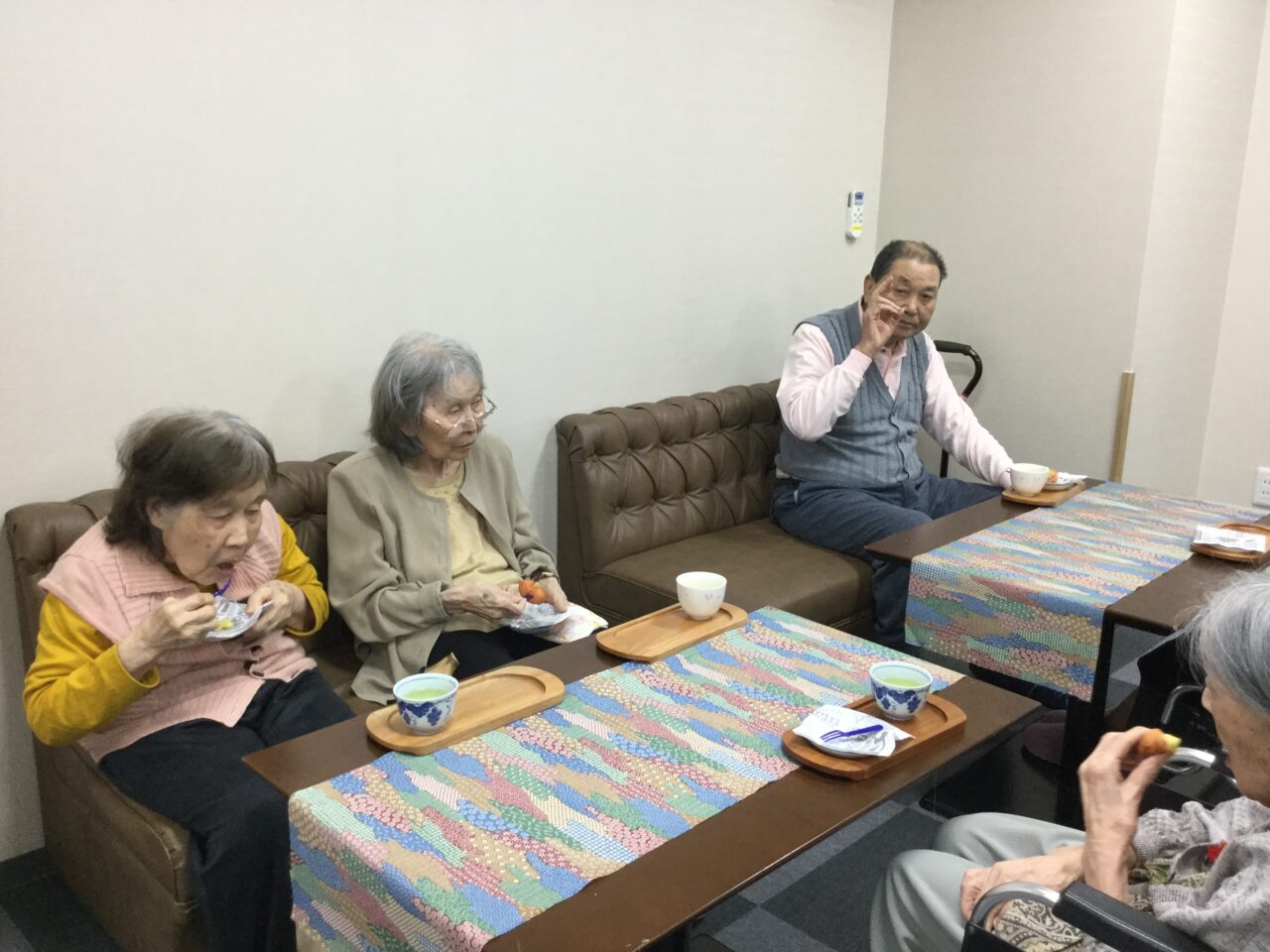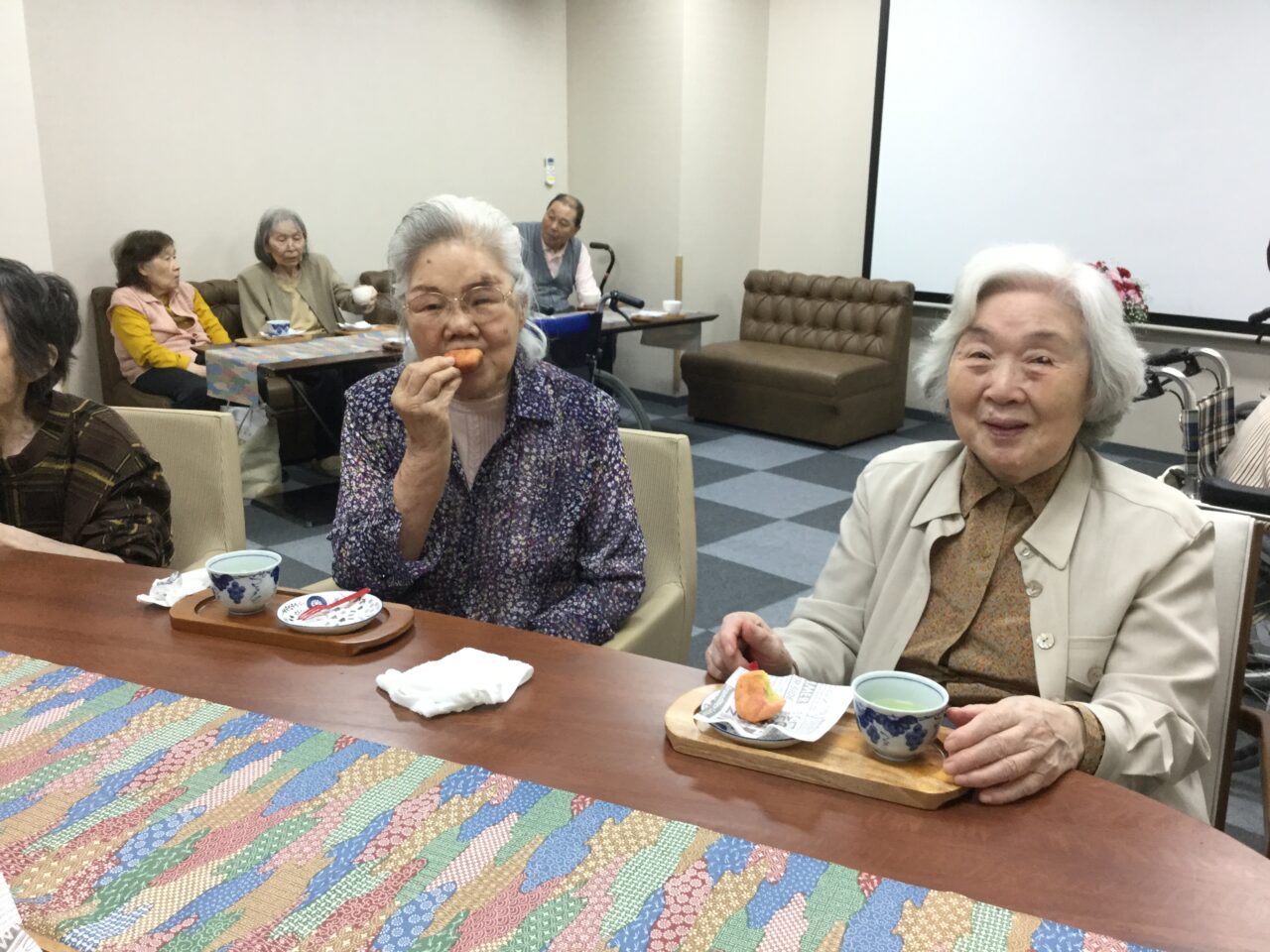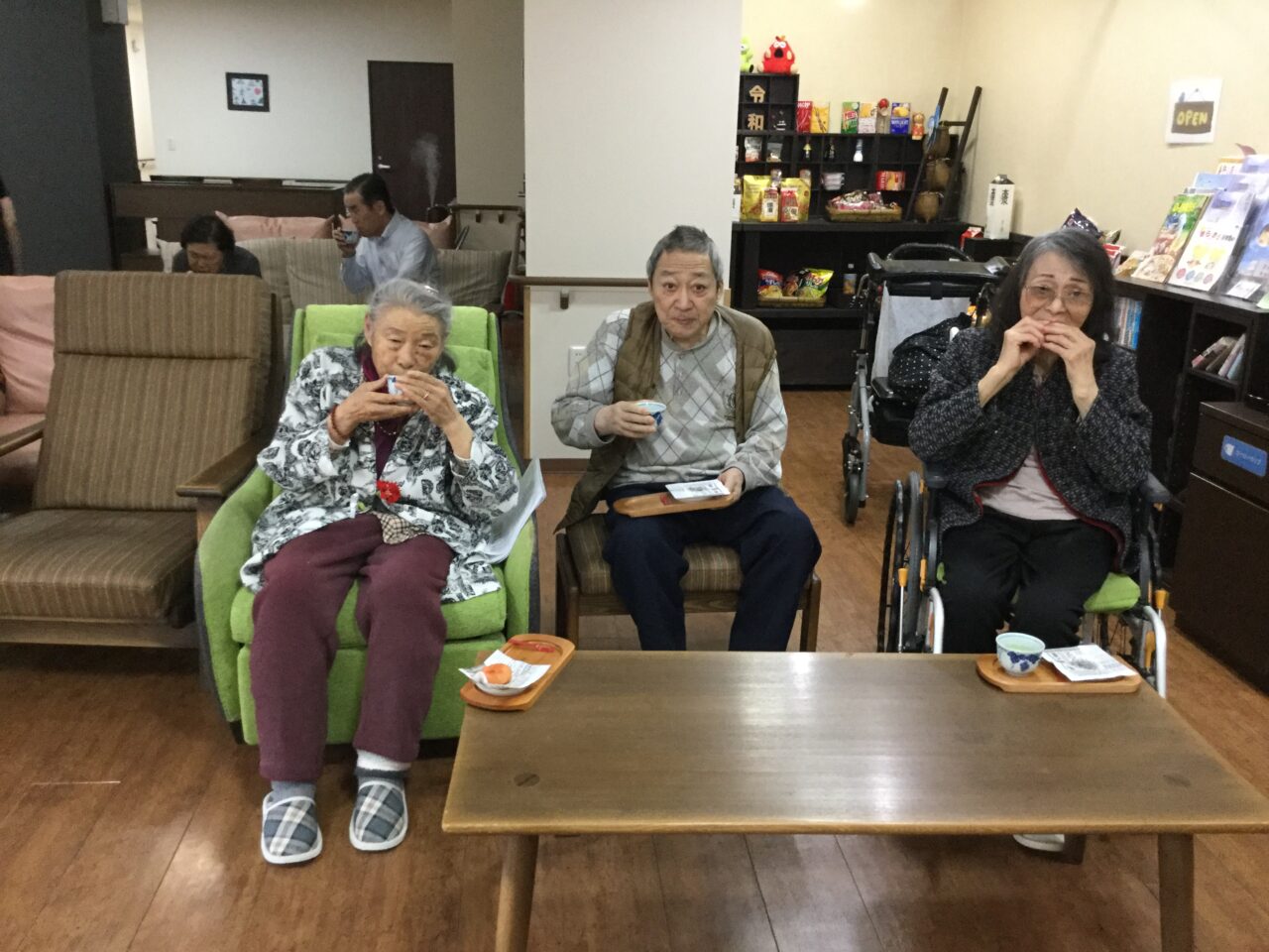 大きな口をあけて真剣に歌っている姿「力強いです頼もしいです」毎日の練習の成果ですね。横手のピアニスト&ハーモニストのお陰です、アッ!指揮者のリードが一番かな?😉そして新茶と🍠揚げで喉を潤し楽しそうで良かったです。