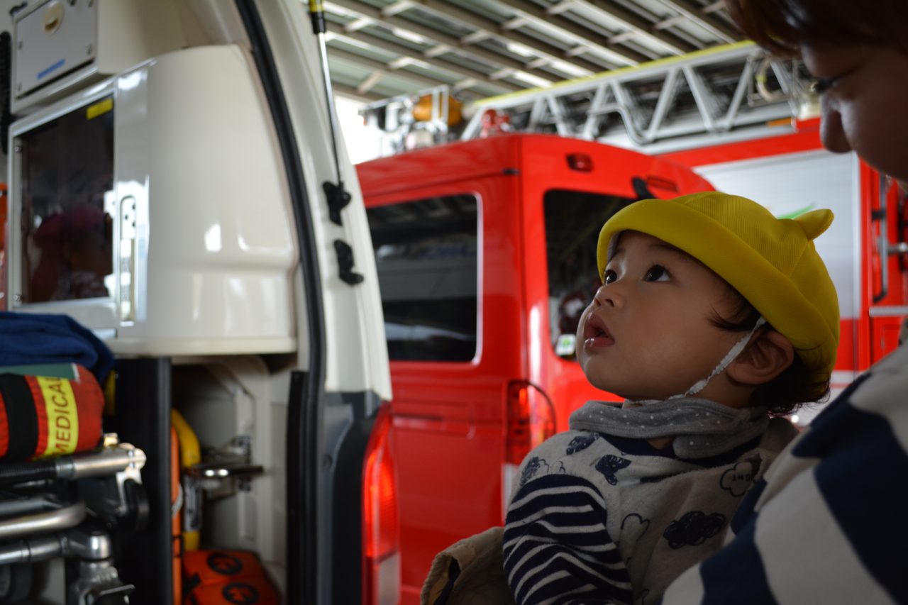 消防署へ到着すると、様々な種類の消防車や、救急車が並んでおり、目をキラキラさせて見つめていました?