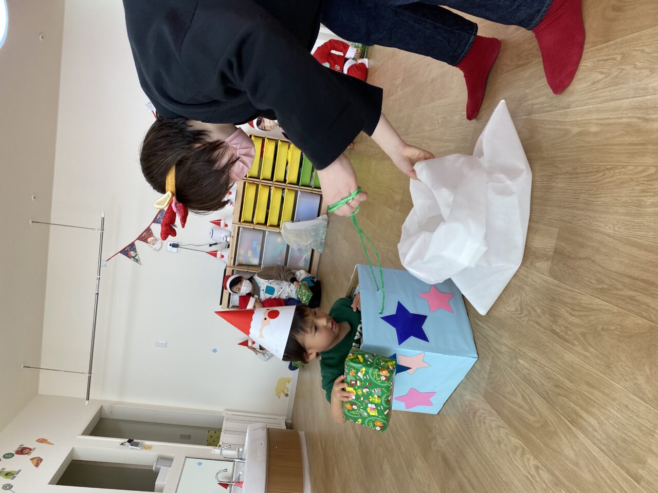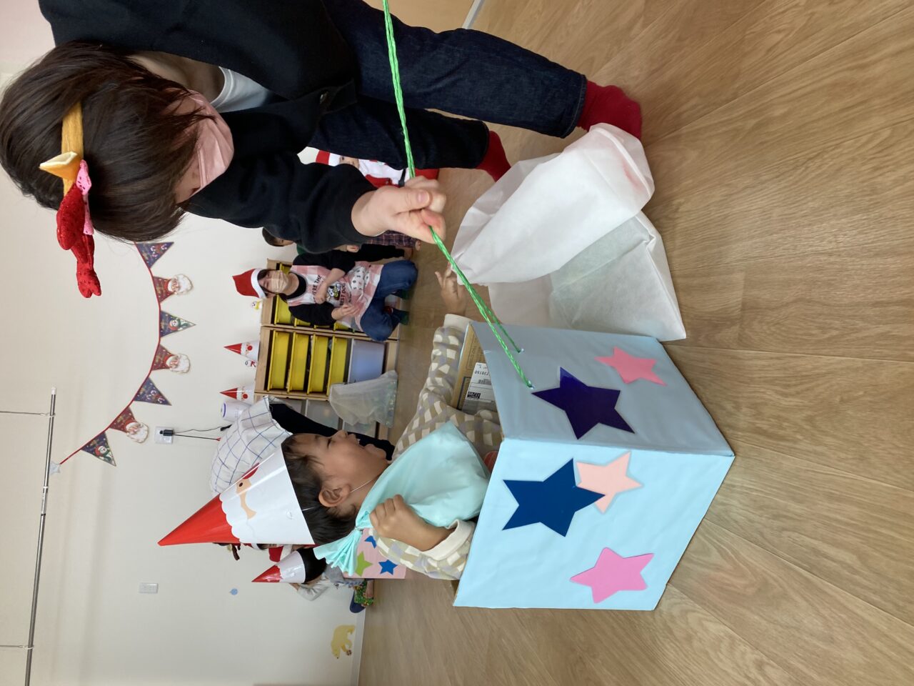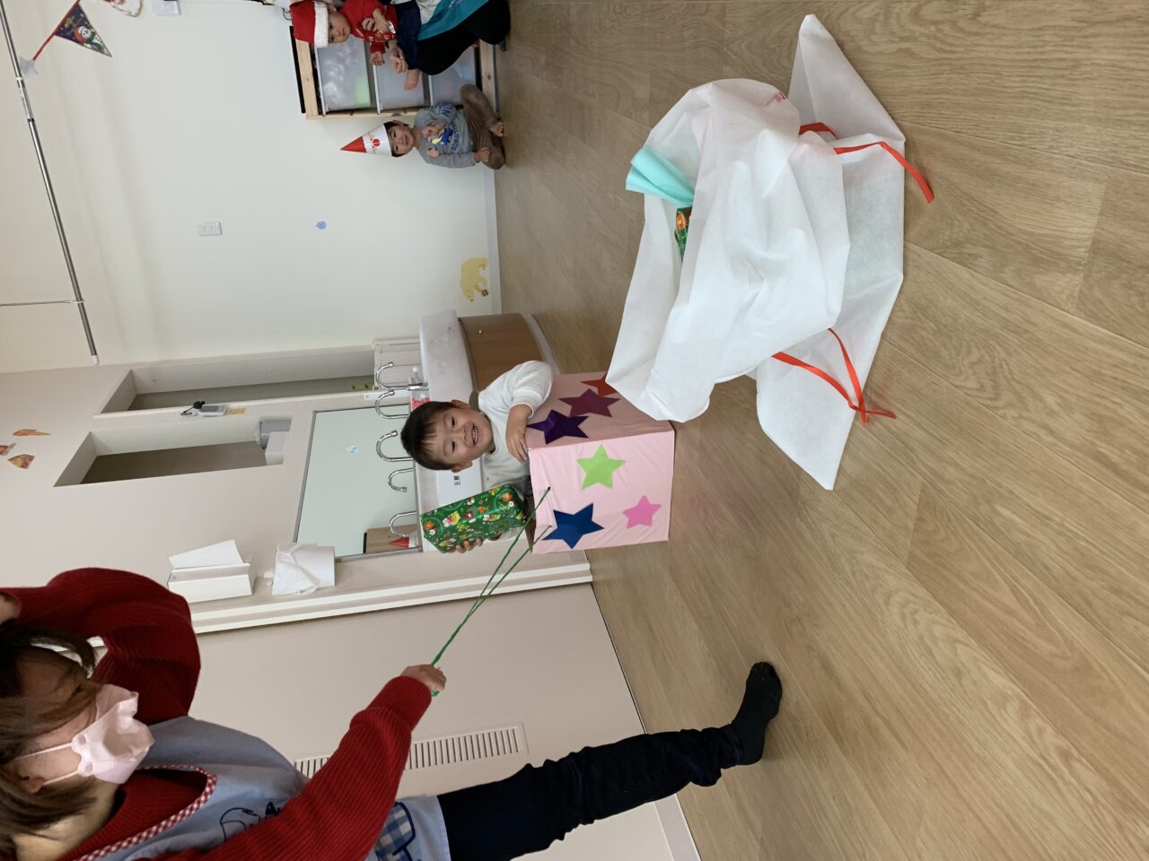 そこで子どもたちにはサンタさんになってプレゼントを運び、袋にプレゼントを入れてもらいます???