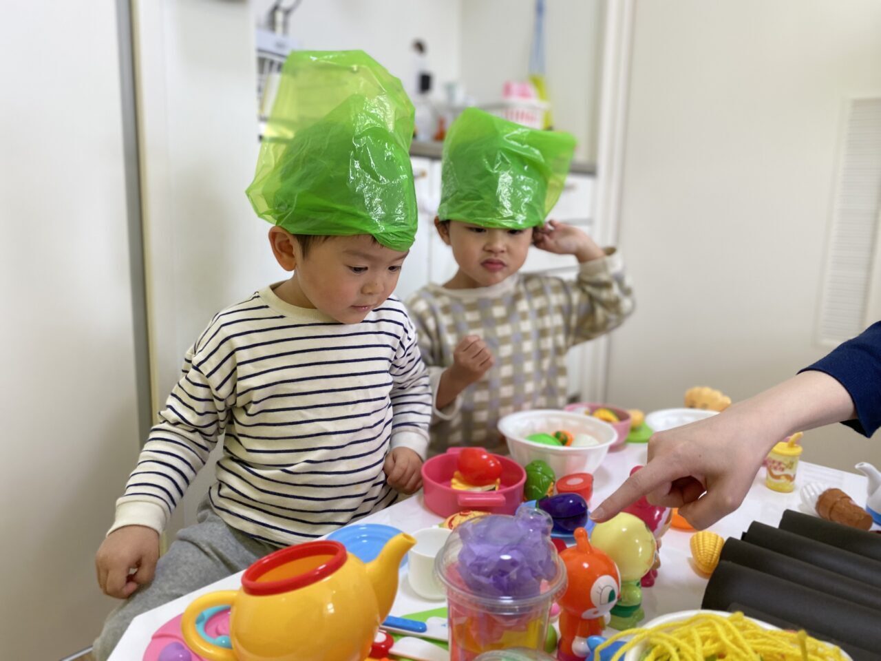 おやおや。お店屋さん役のお友達、頭巾が反対になっていますが?