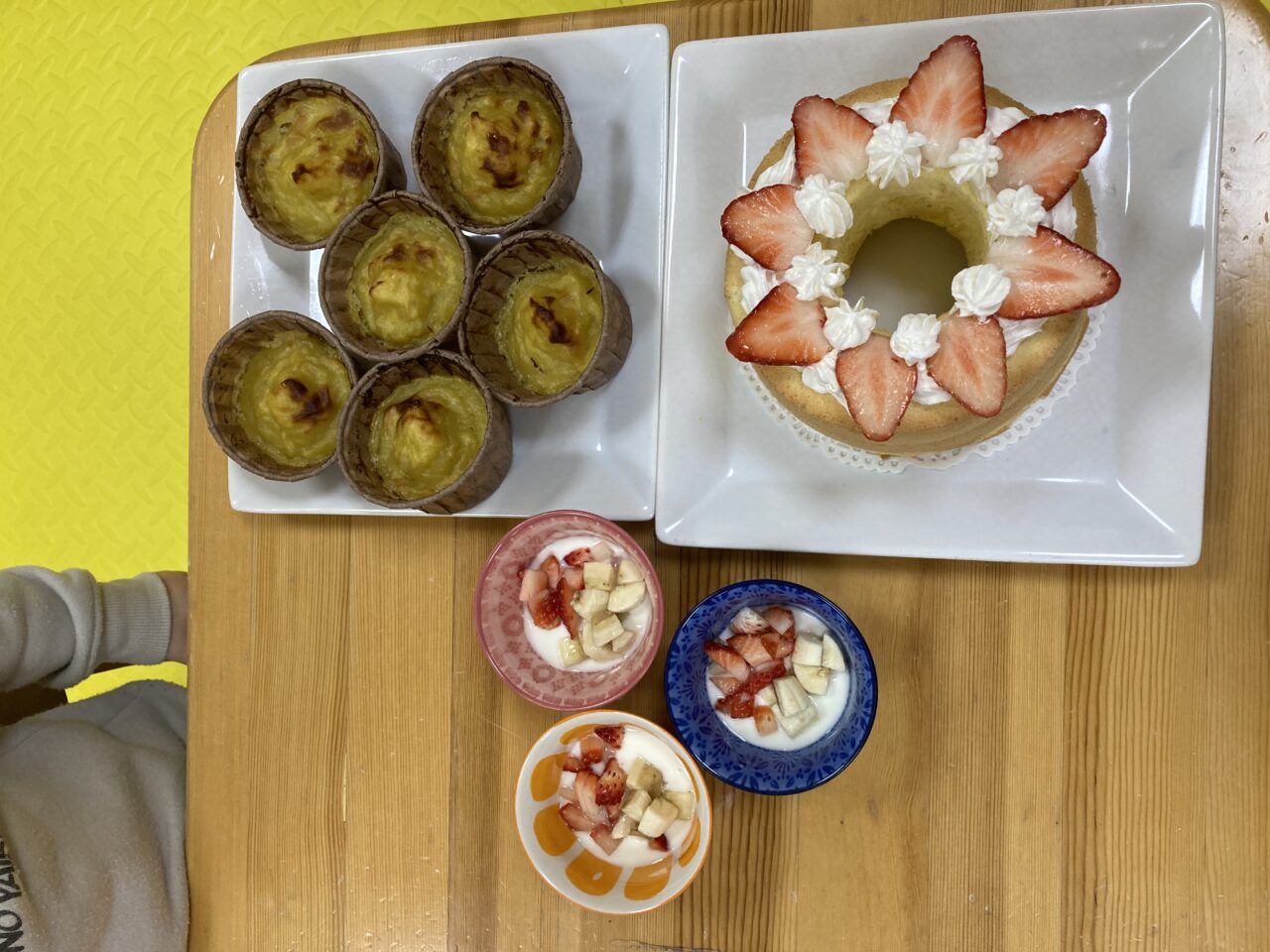 お待ちかねの午後のお楽しみ!今日のおやつは特別メニューで、シフォンケーキ、スイートポテト、フルーツヨーグルトを一富士さんに作っていただきました??いちごのシフォンケーキをみて、「かわいいねー」「おいしそうだねー」と子ども達もにっこりでした❤️一富士さんありがとうございました?