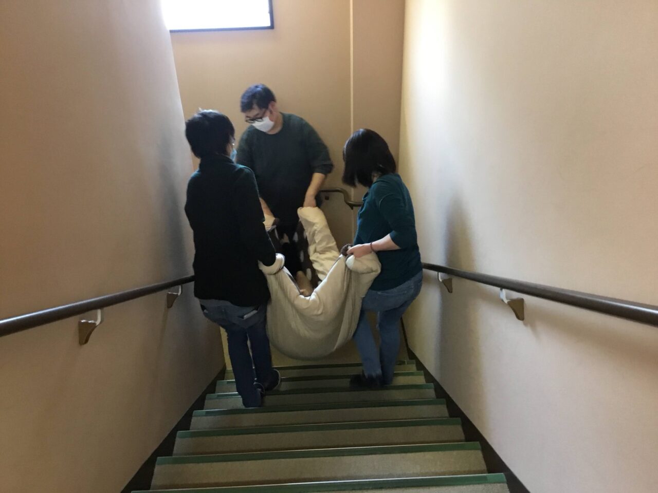 消火訓練の後は、停電でエレベーターが使えないという想定で布団で安全にご利用者さんを移送する訓練を行いました??