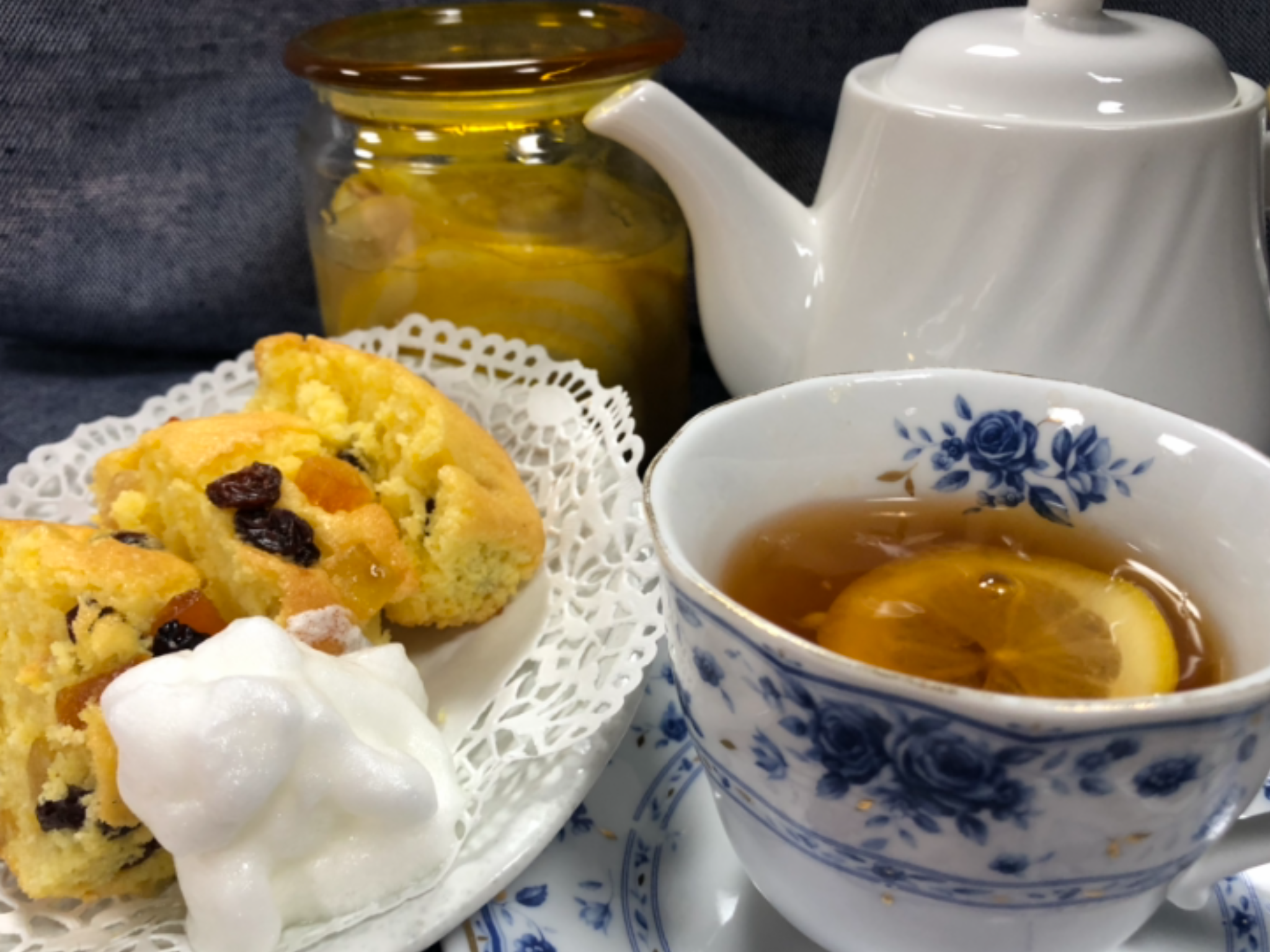 照井パートナー手作りのドライフルーツたっぷりのパウンドケーキと、加藤パートナー手作りのレモンの蜂蜜漬けの入ったレモンティーでお出迎えです?