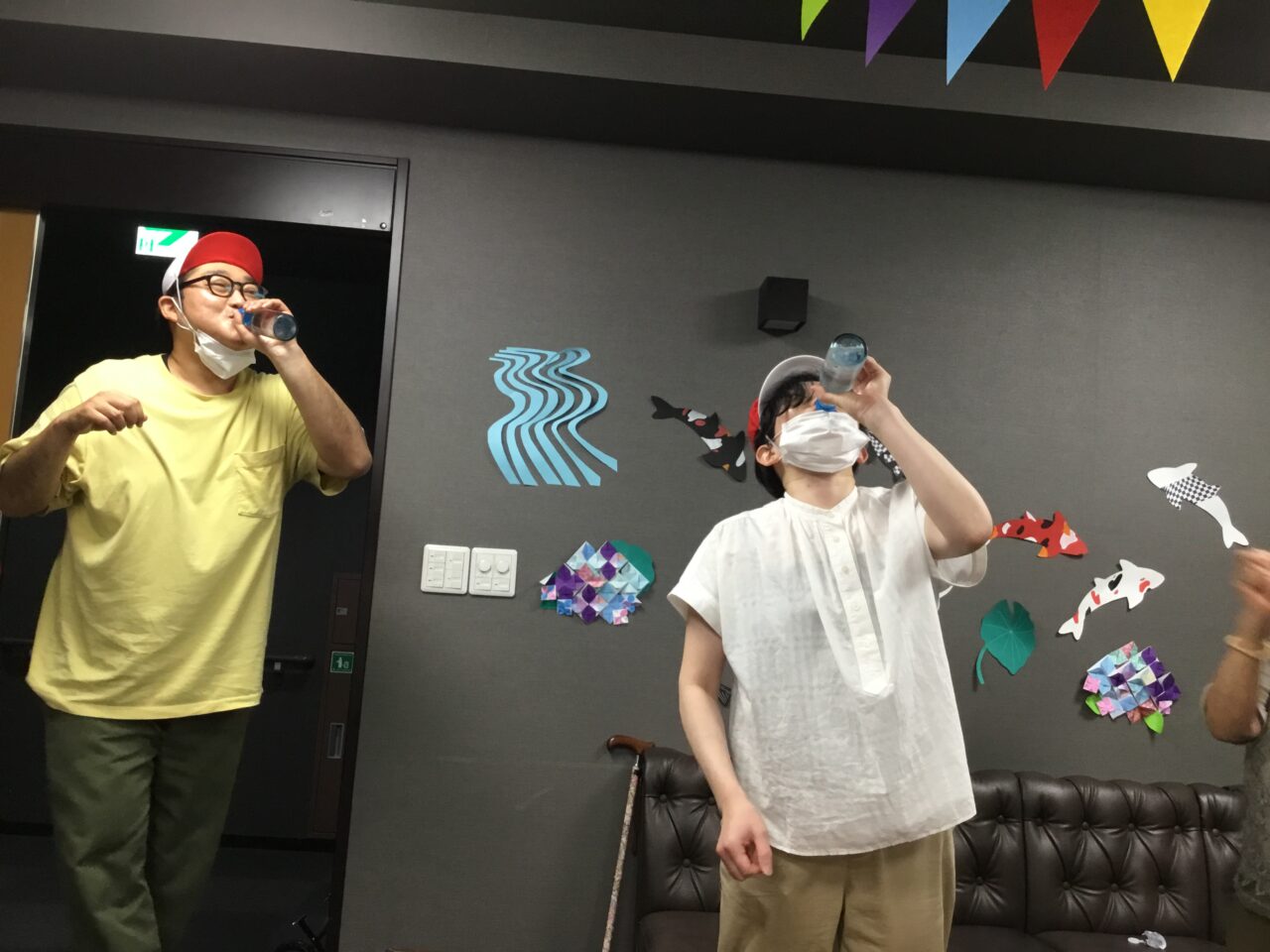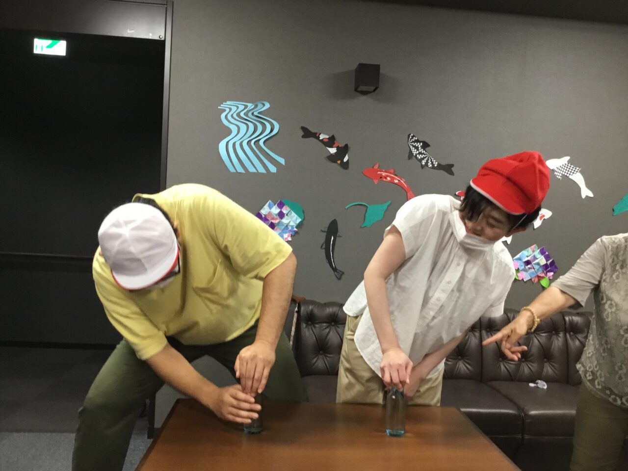 サイダーの炭酸のキツさと飲みにくいに苦戦します。そして、空の瓶を釣って頂き、リレー対決に移ります!