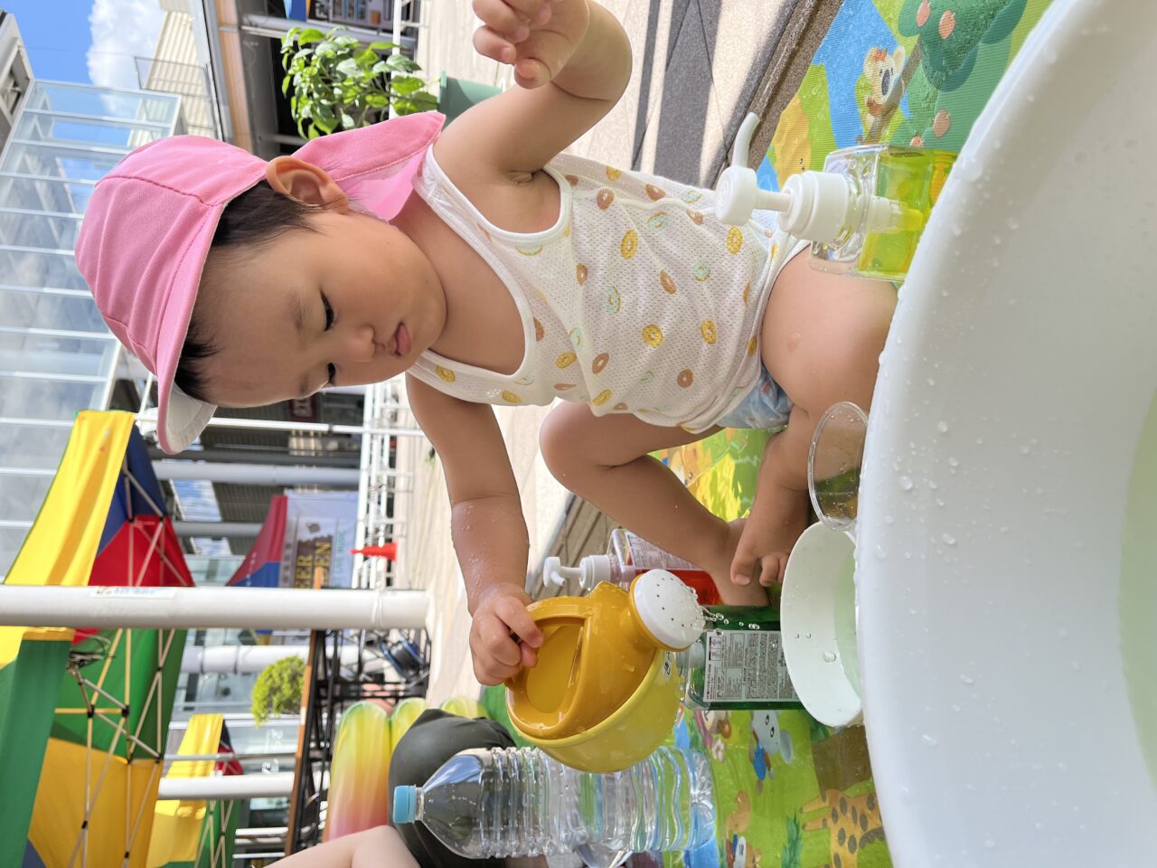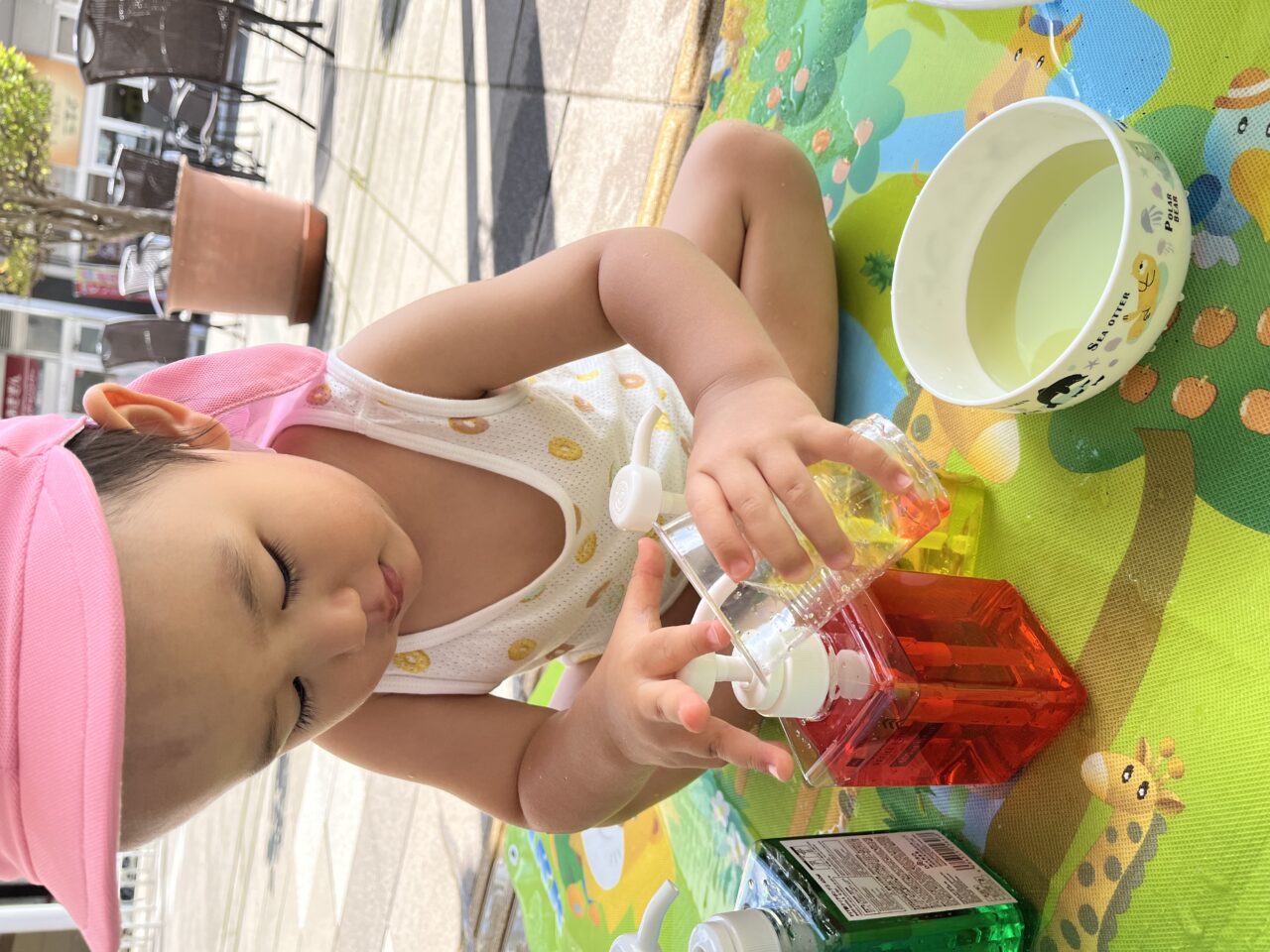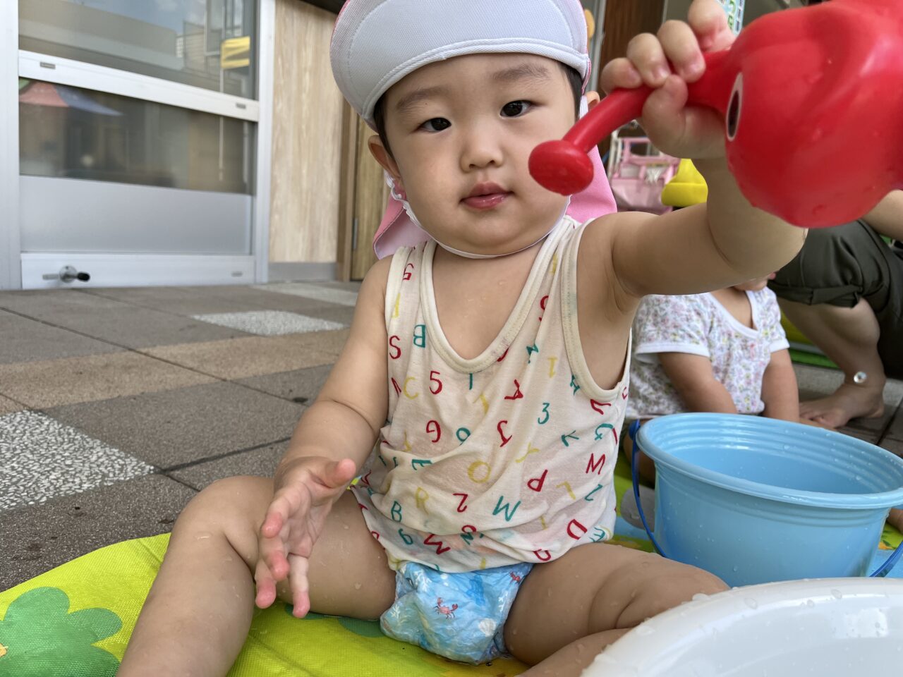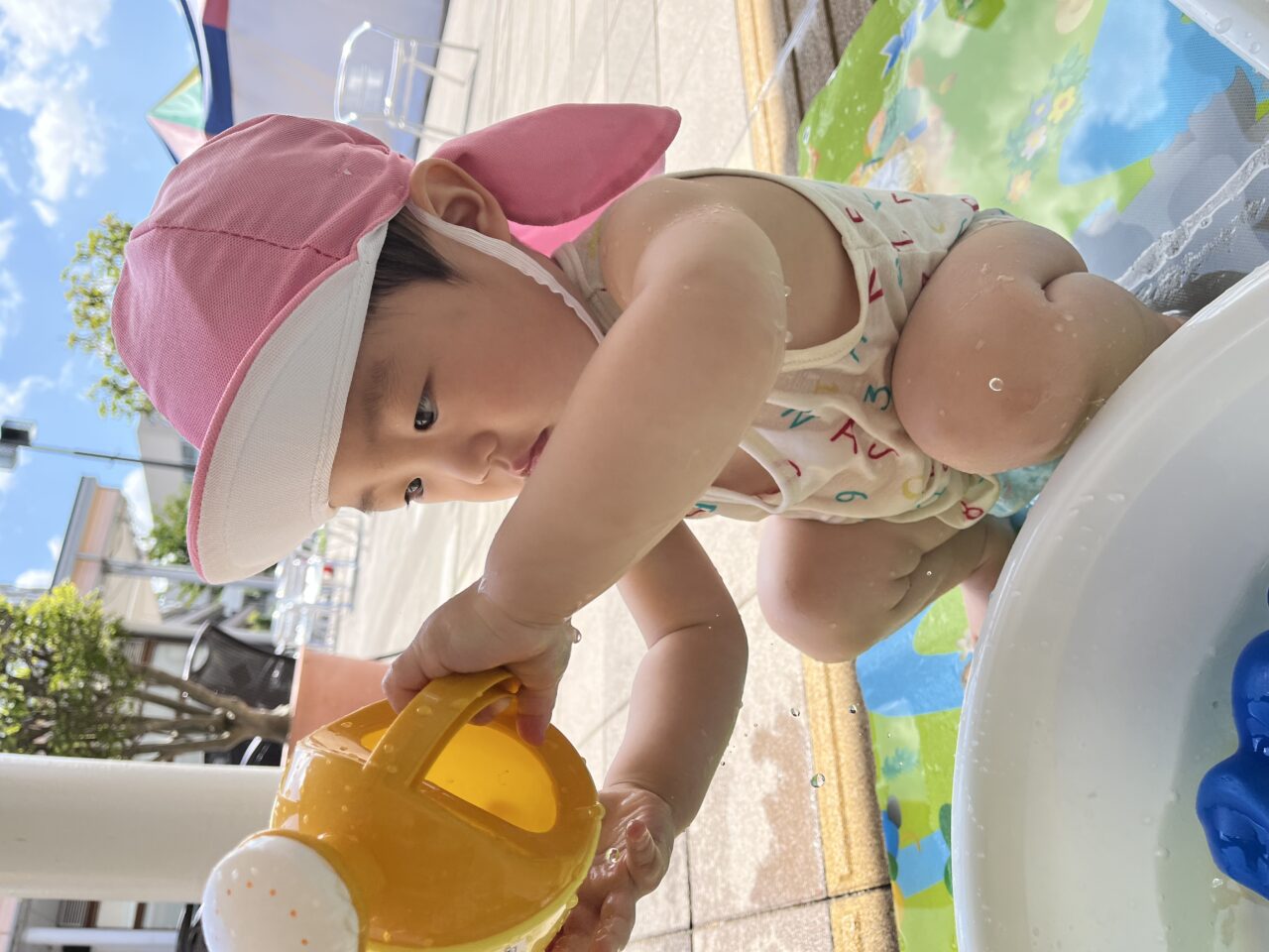 お水遊びは、大好きですねぇ♡プールは怖いけど、自分のペースで遊べる水遊びは大喜び!