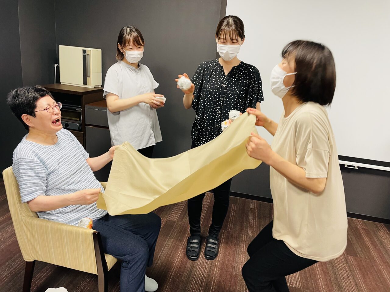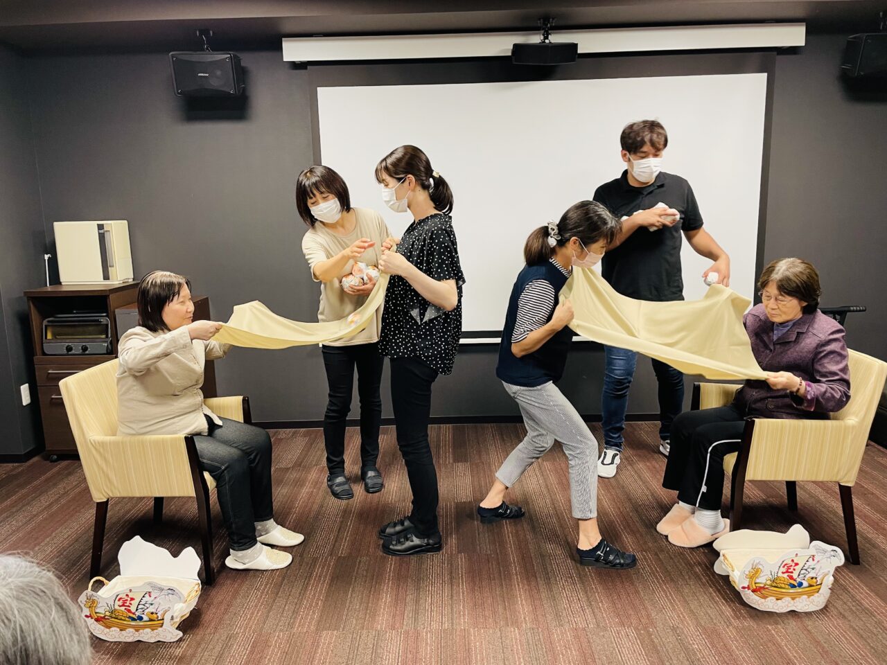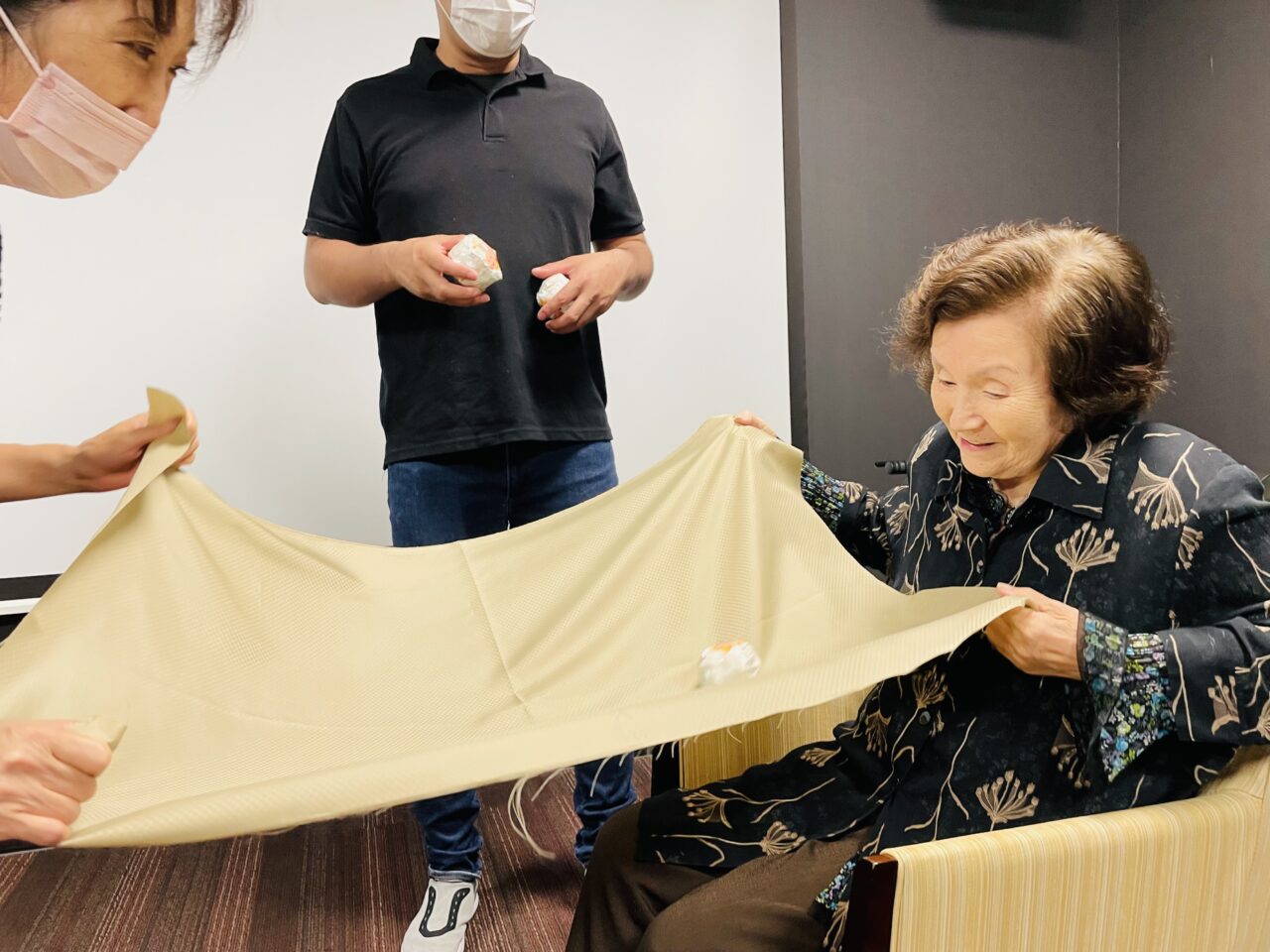 座って、布の両端を持ってもらい上手く調整しながらボールをカゴに入れるゲームです♪