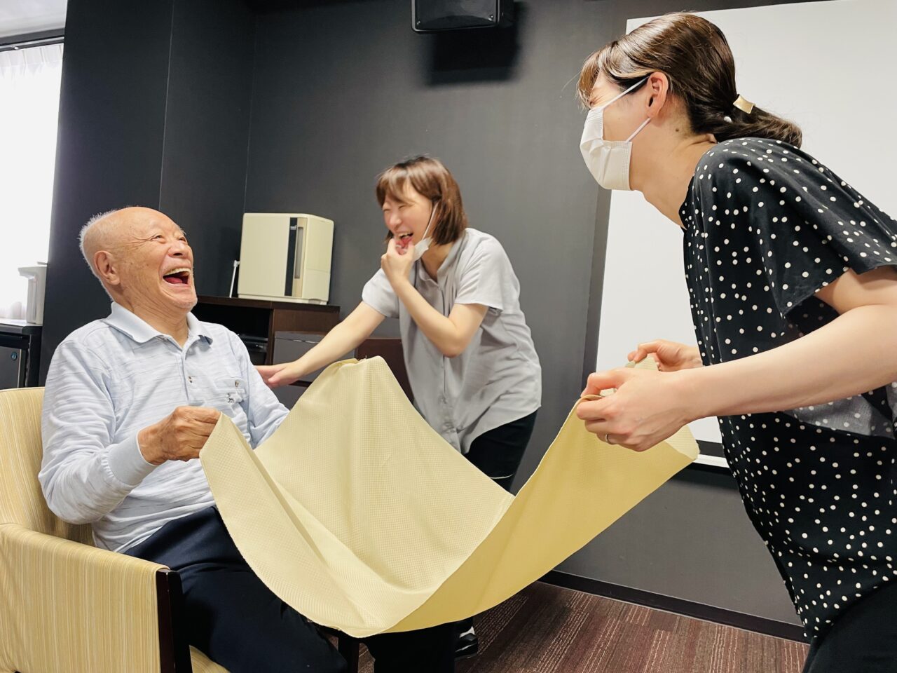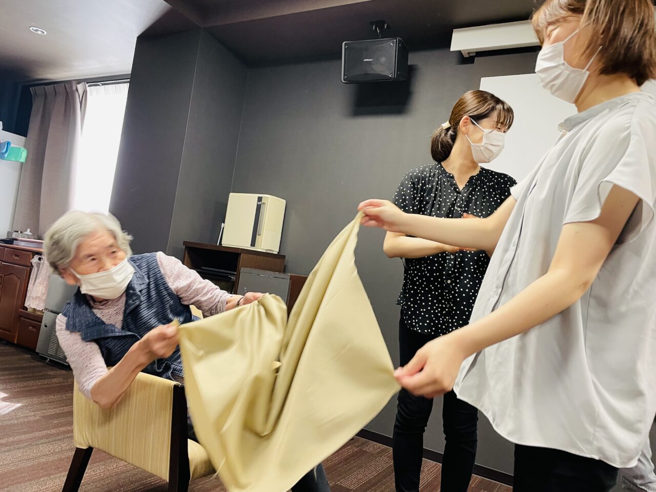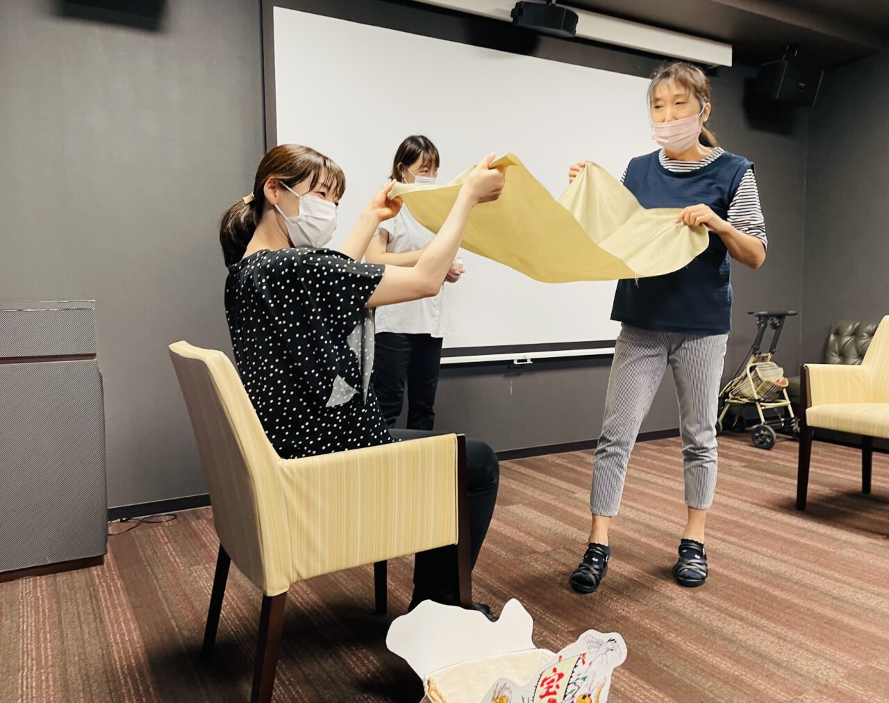座って、布の両端を持ってもらい上手く調整しながらボールをカゴに入れるゲームです♪