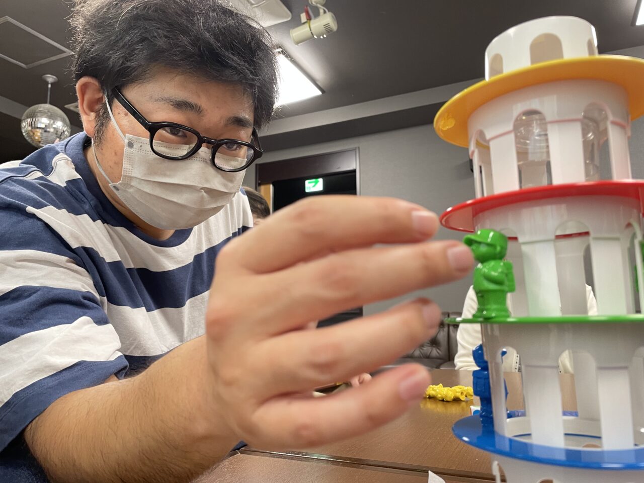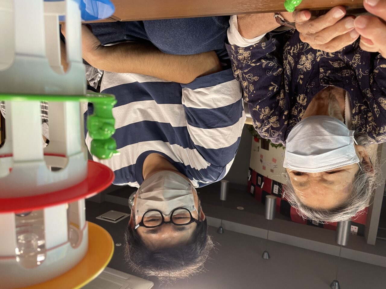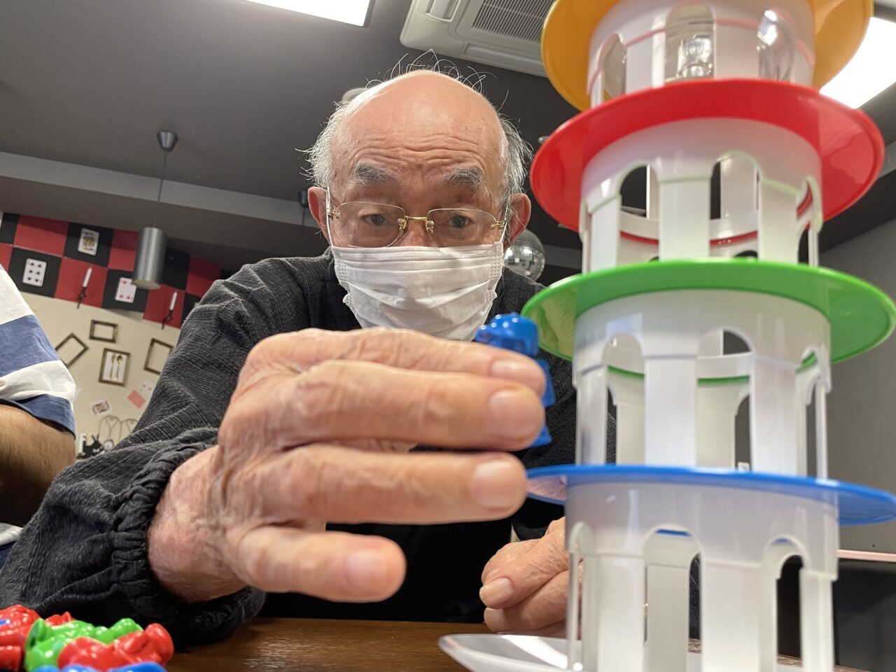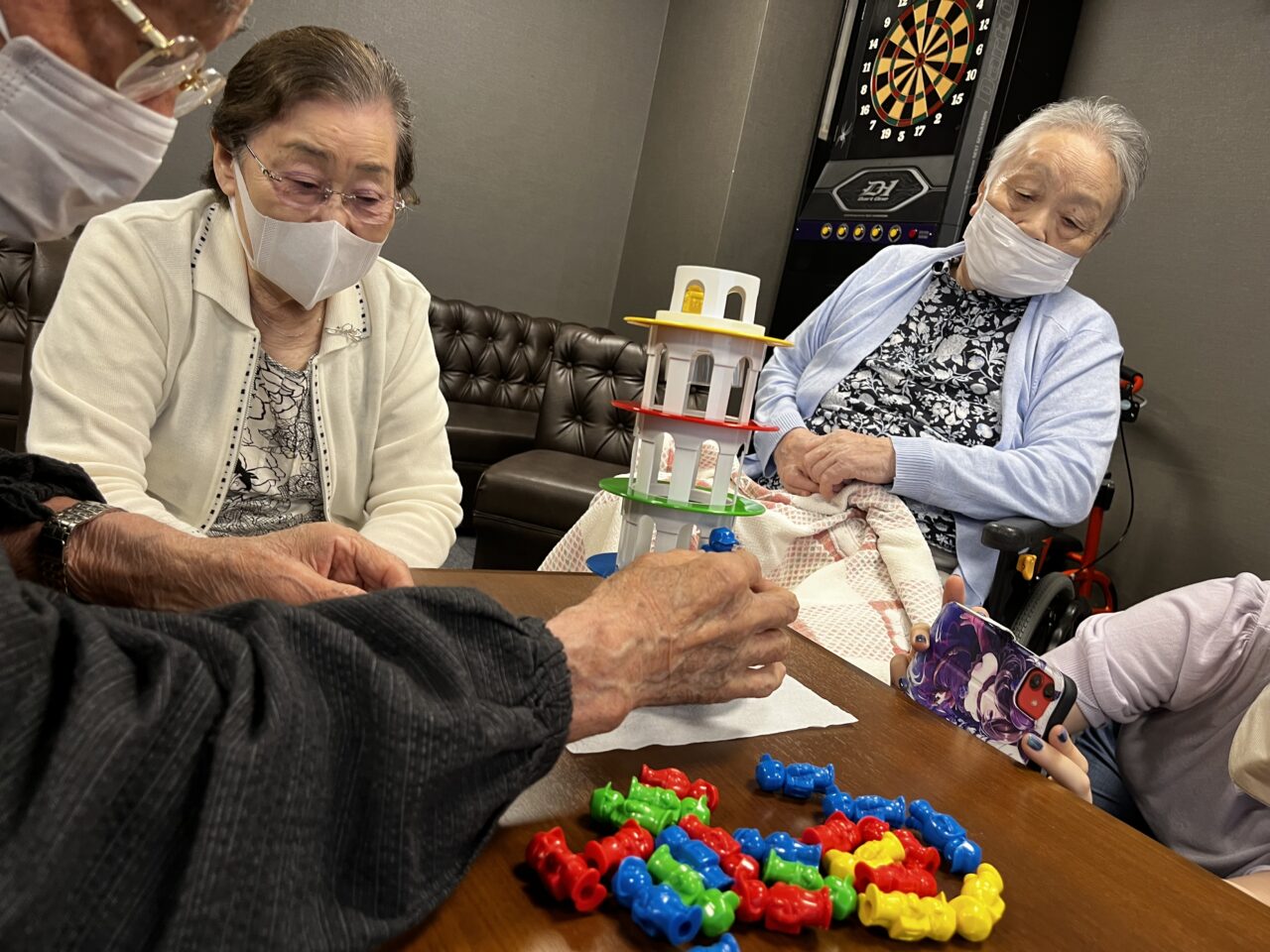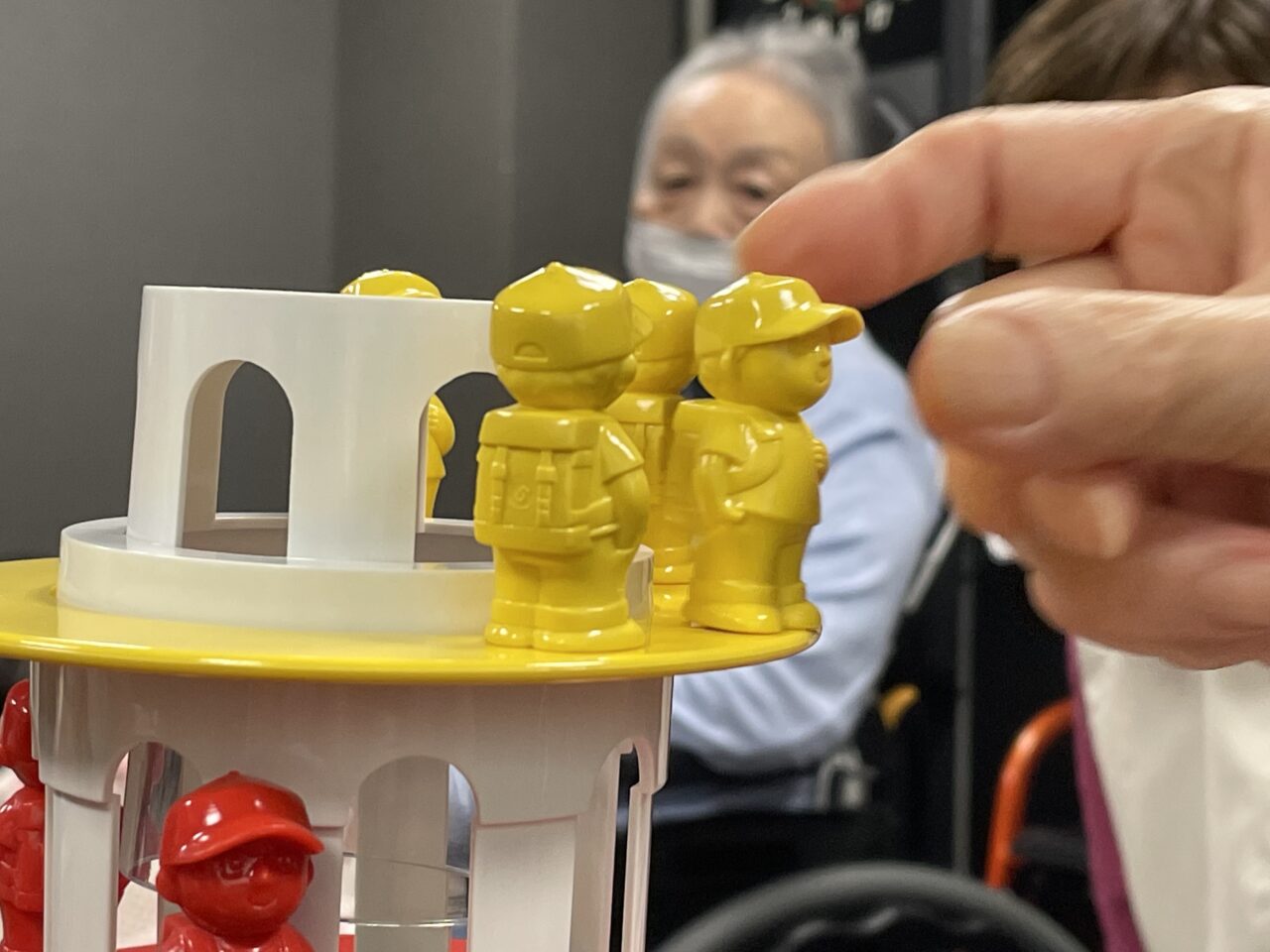 サイコロ?を振って出た色の人形をタワーの同じ色の部分に置いて行くゲームです♟️タワーを倒さないようにバランス良く人形を置くのが意外と難しいんです?皆さん「そこでね〜」「こっちさ置けばよ〜」等の声がけでバランス良く置いていかれます。こちらも紙相撲に負けず劣らず盛り上がります。??