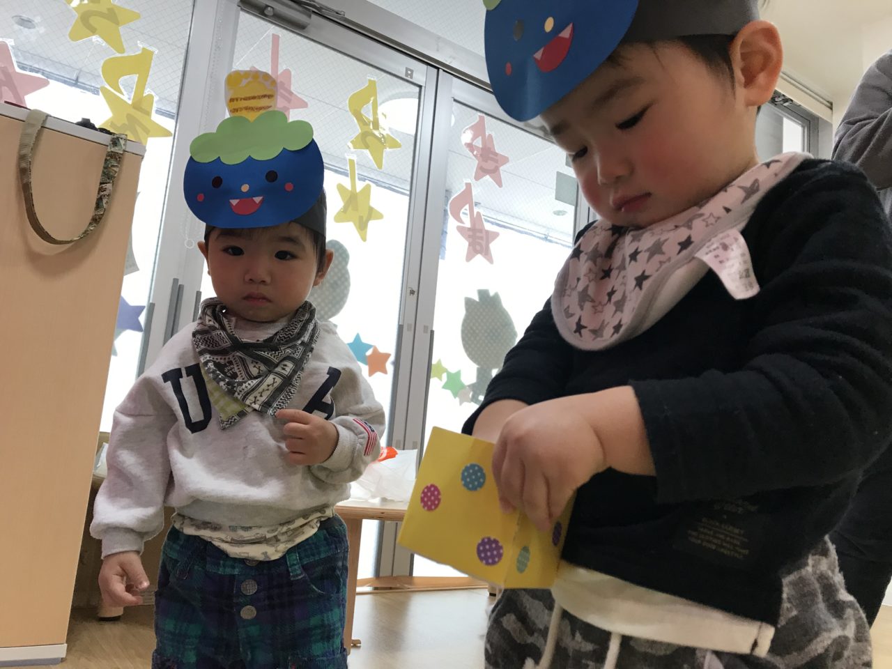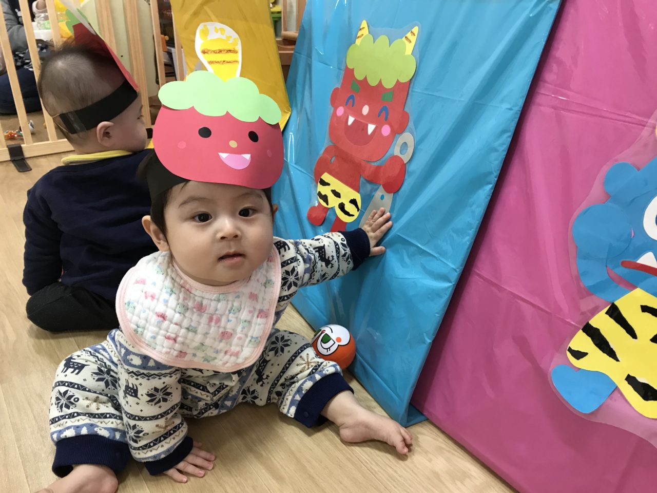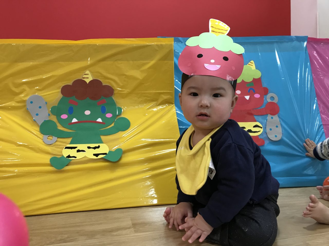 まだ小さいほし組さんですが、ボールを投げたり、手で鬼をたたいたりと頑張って鬼退治しましたよ✨✨