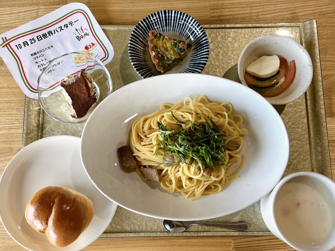 メニューは和風きのこパスタ、プチパン、キッシュ、カプレーゼ、クラムチャウダー、ティラミスです?