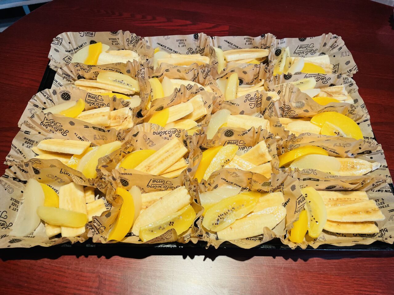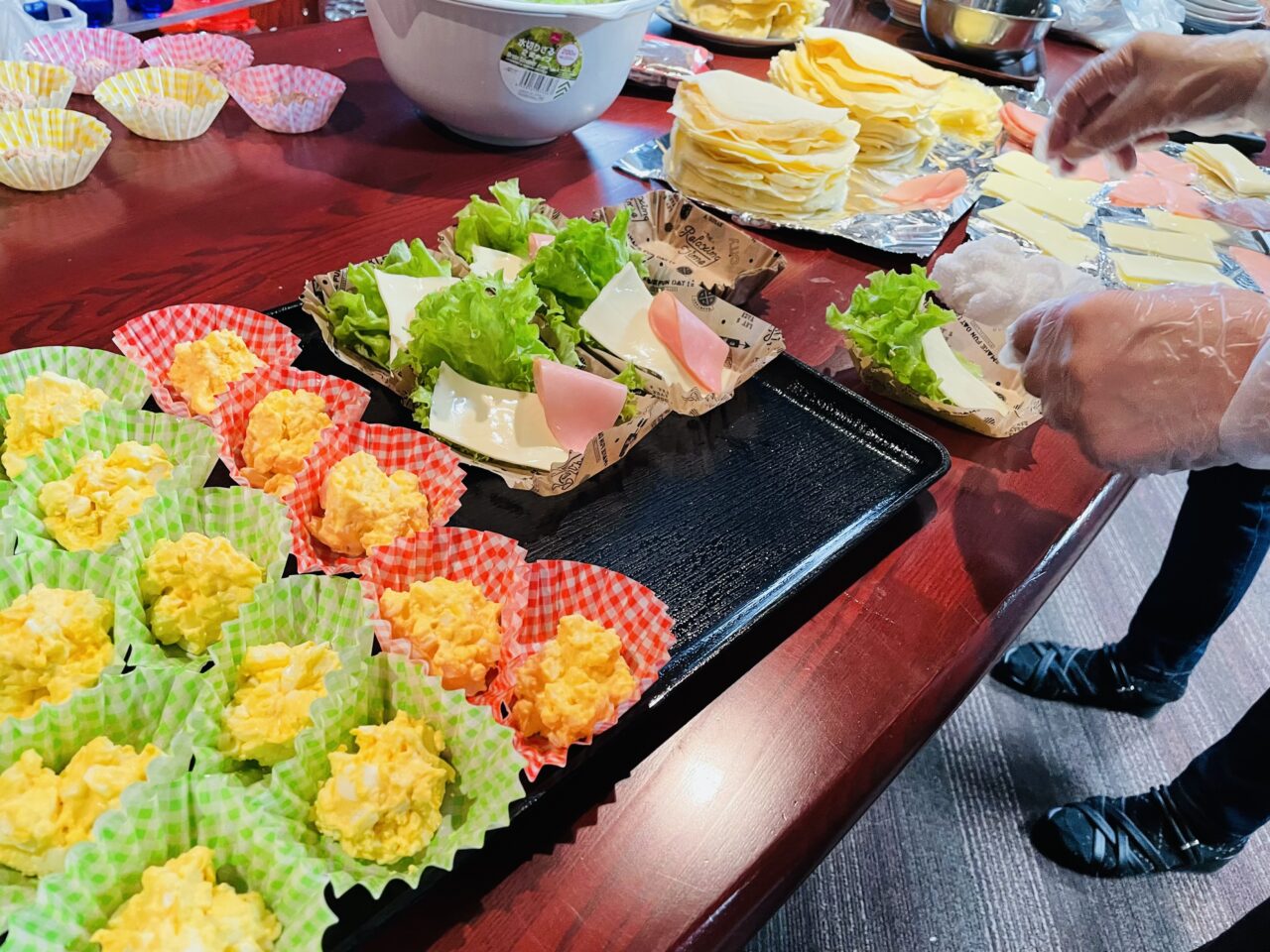 その間に、桃やバナナ等のフルーツをカットし、茹で卵で卵サラダを、ハムとチーズも準備します。彩りにプリーツレタス?