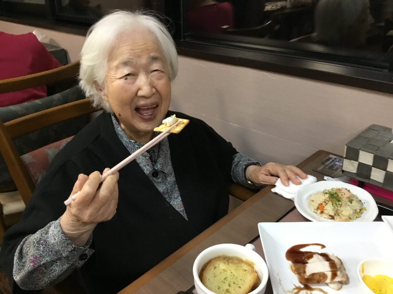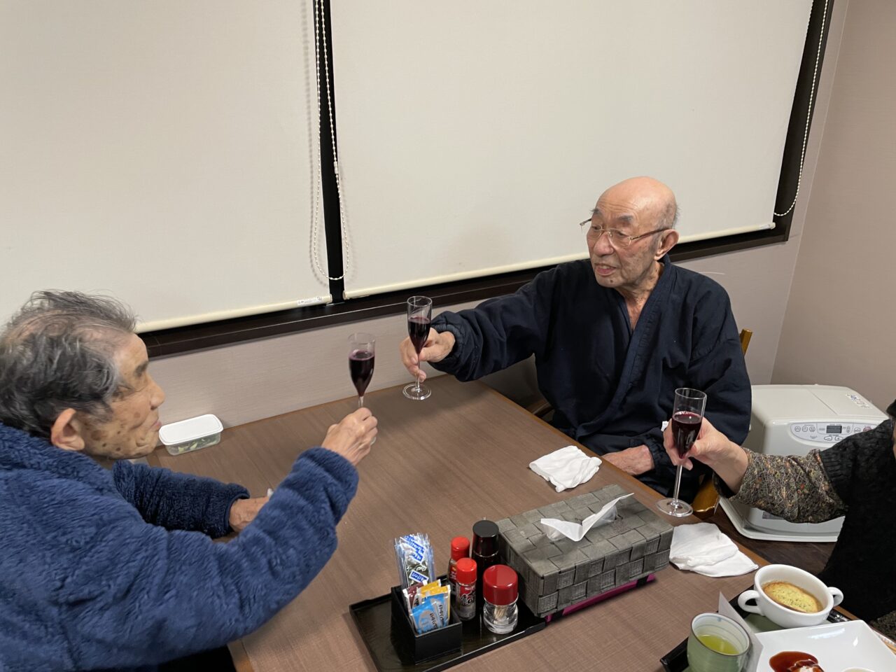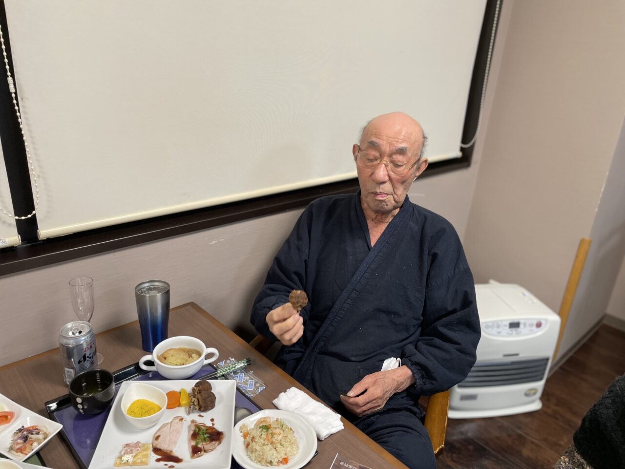 ご飯を待ちきれずにカンパイされたり同テーブルの方と何度もカンパイされたり楽しまれておりました?また、職員お手製のカナッペや干し柿も好評で「この柿どこから買ってきたの❓」「ワインに合うわね?」とのお言葉を頂きました?