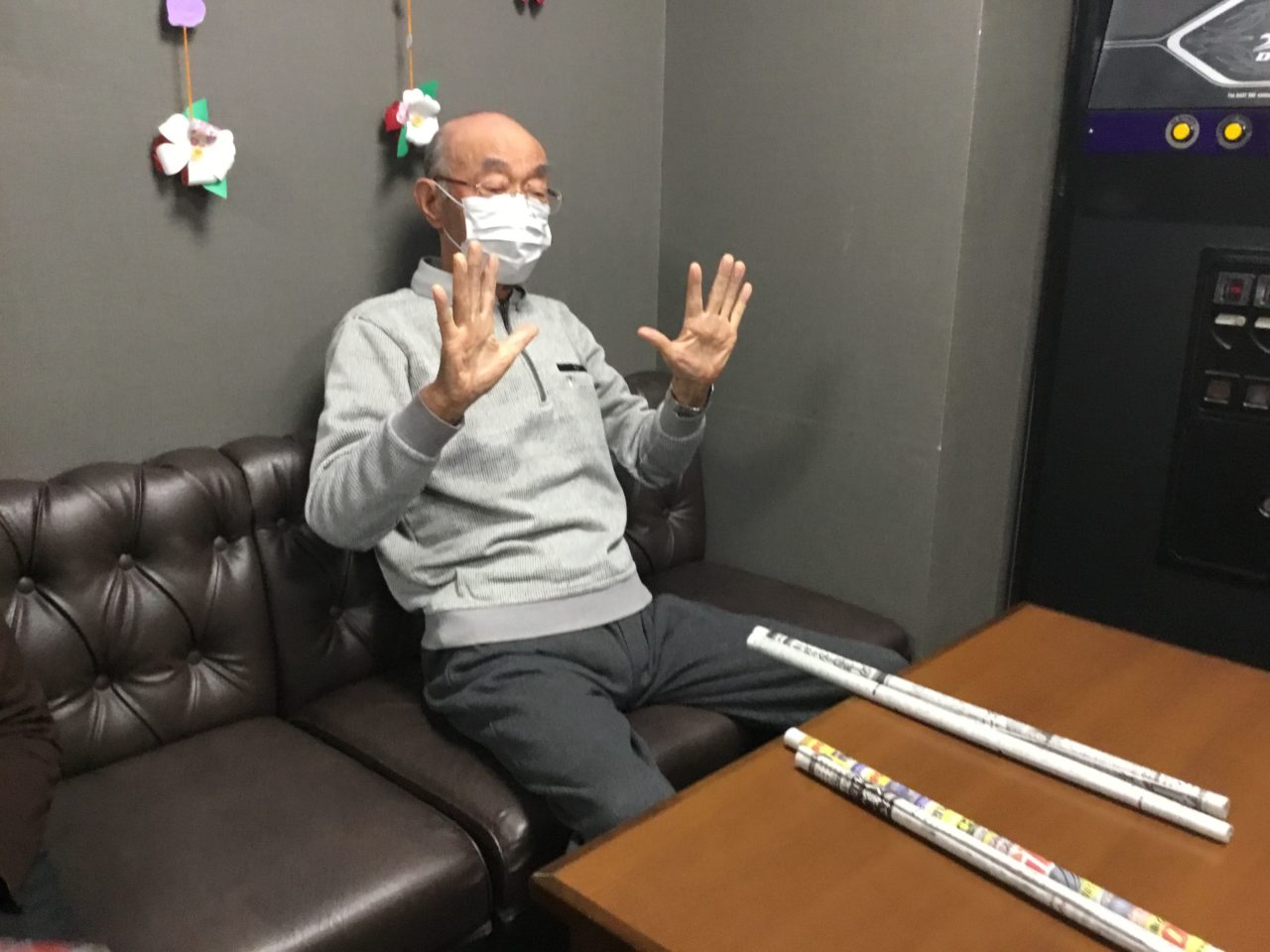 手拍子の代わりに新聞紙でテーブルを叩いて?ドンドンドン?