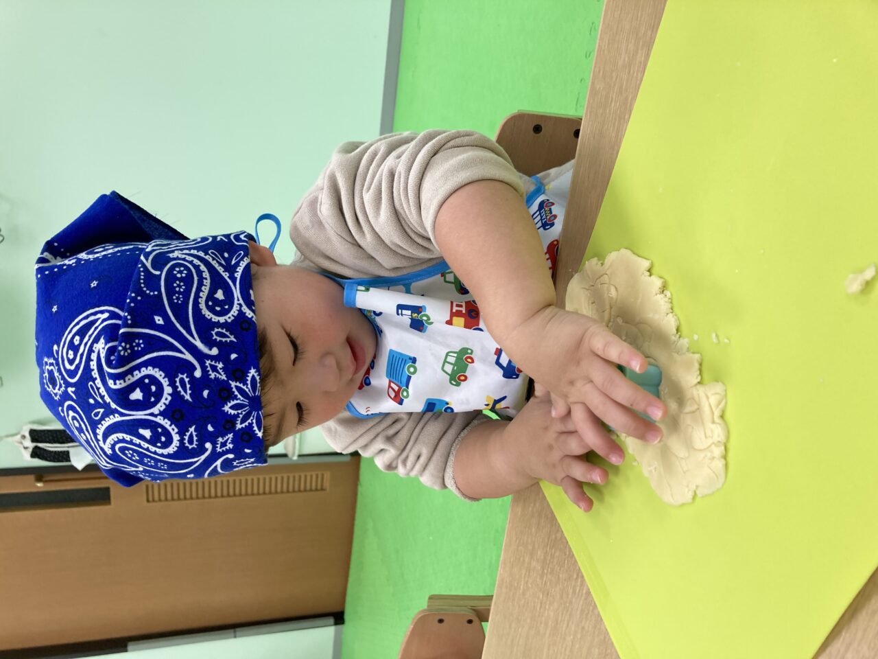 保育者と一緒にコロコロと生地を伸ばしていきます。