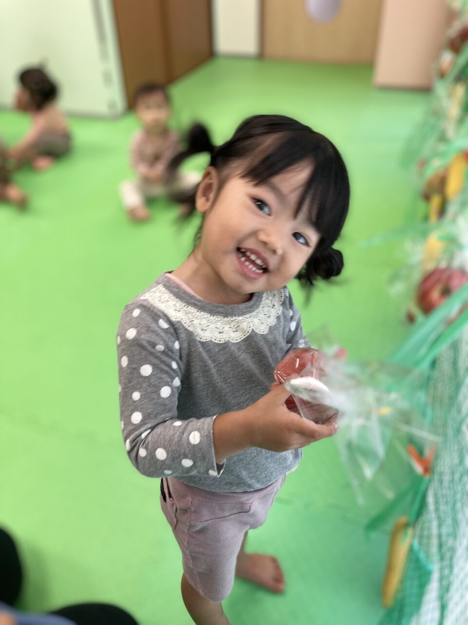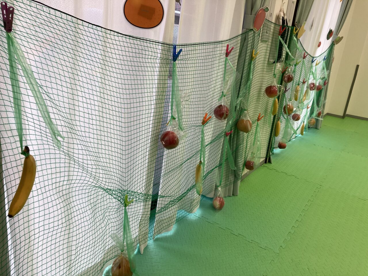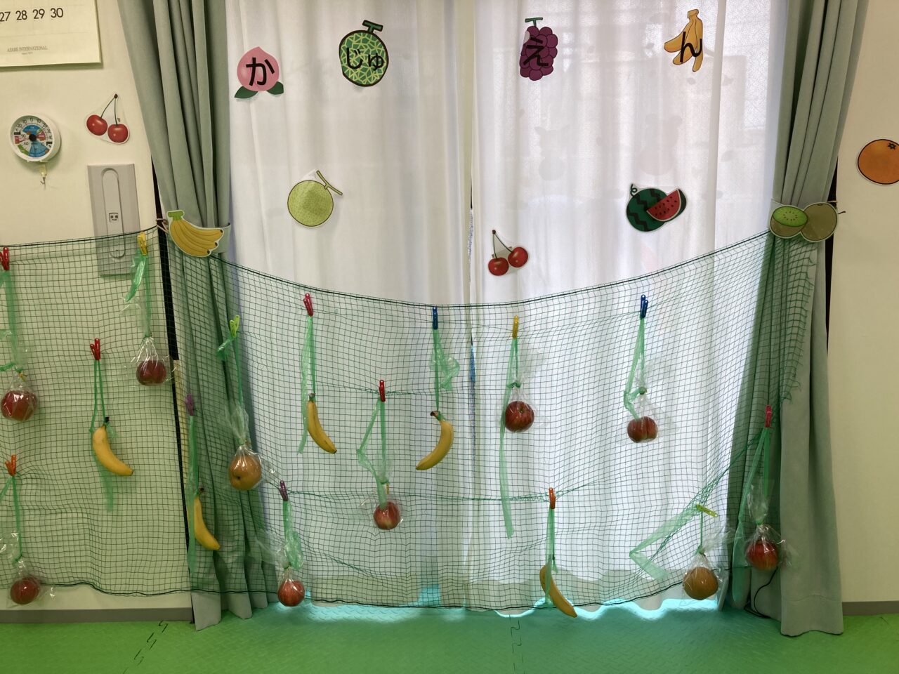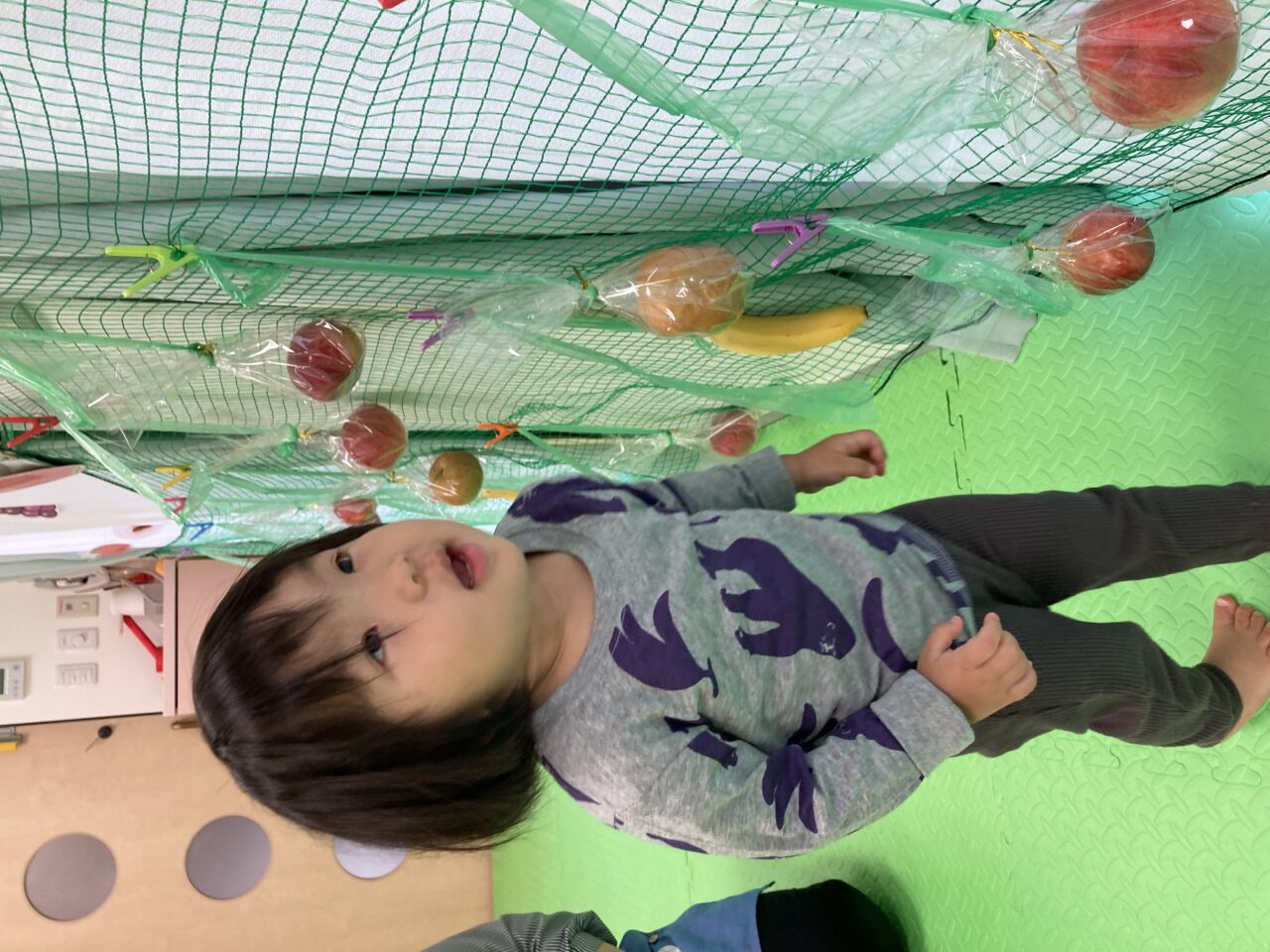 今年のきらきら果樹園にぶら下がっている果物は、バナナ、りんご、梨、桃です♪?みんなどれがいいかなー???