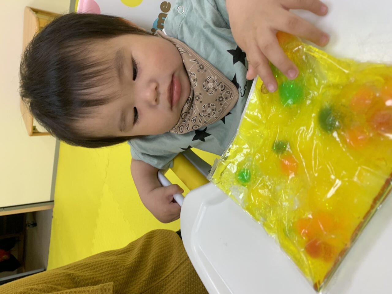 感触遊びは、センサリーバッグを作ってグニュグニュと触ってみては不思議そうな表情をしたり、