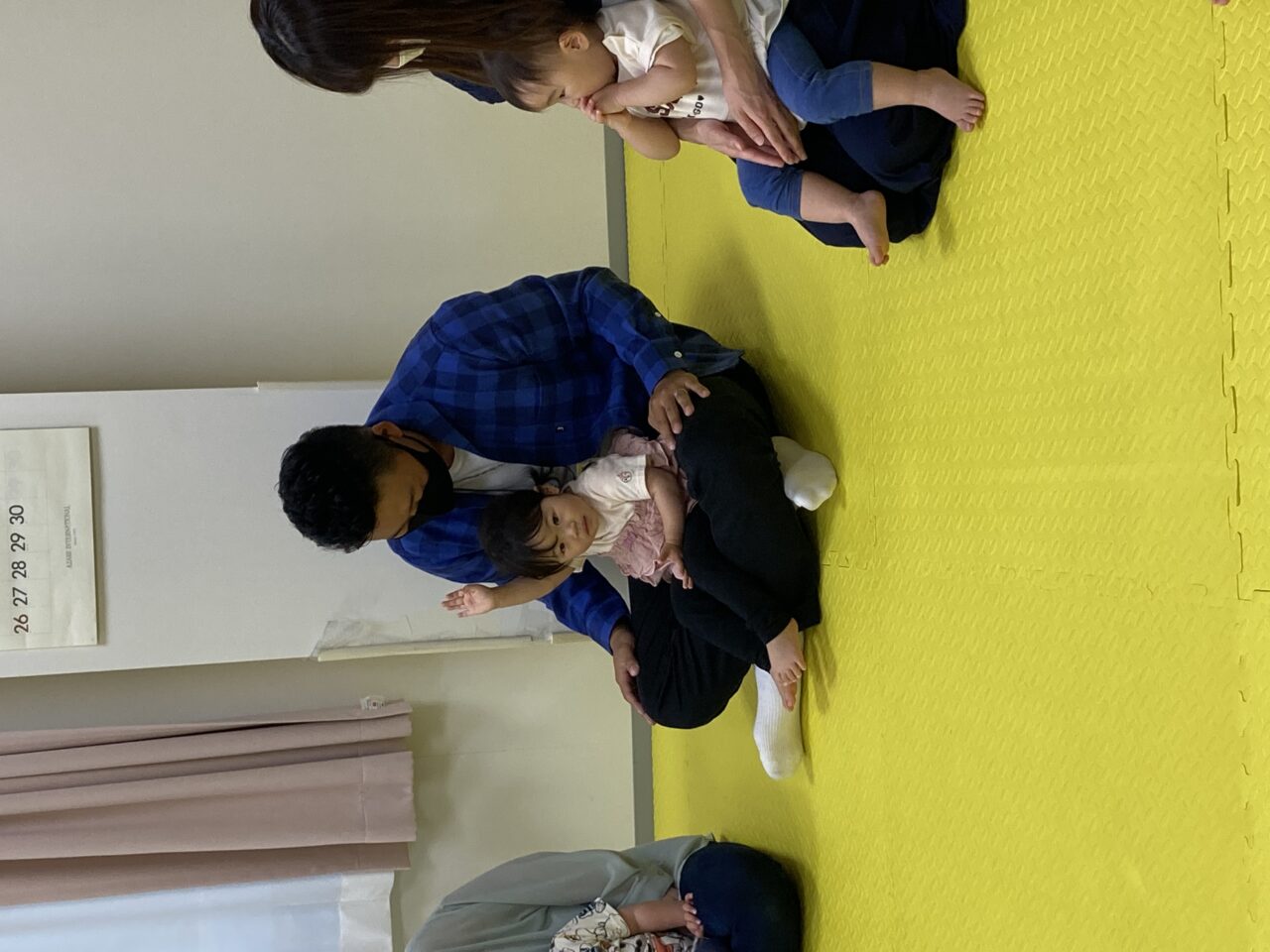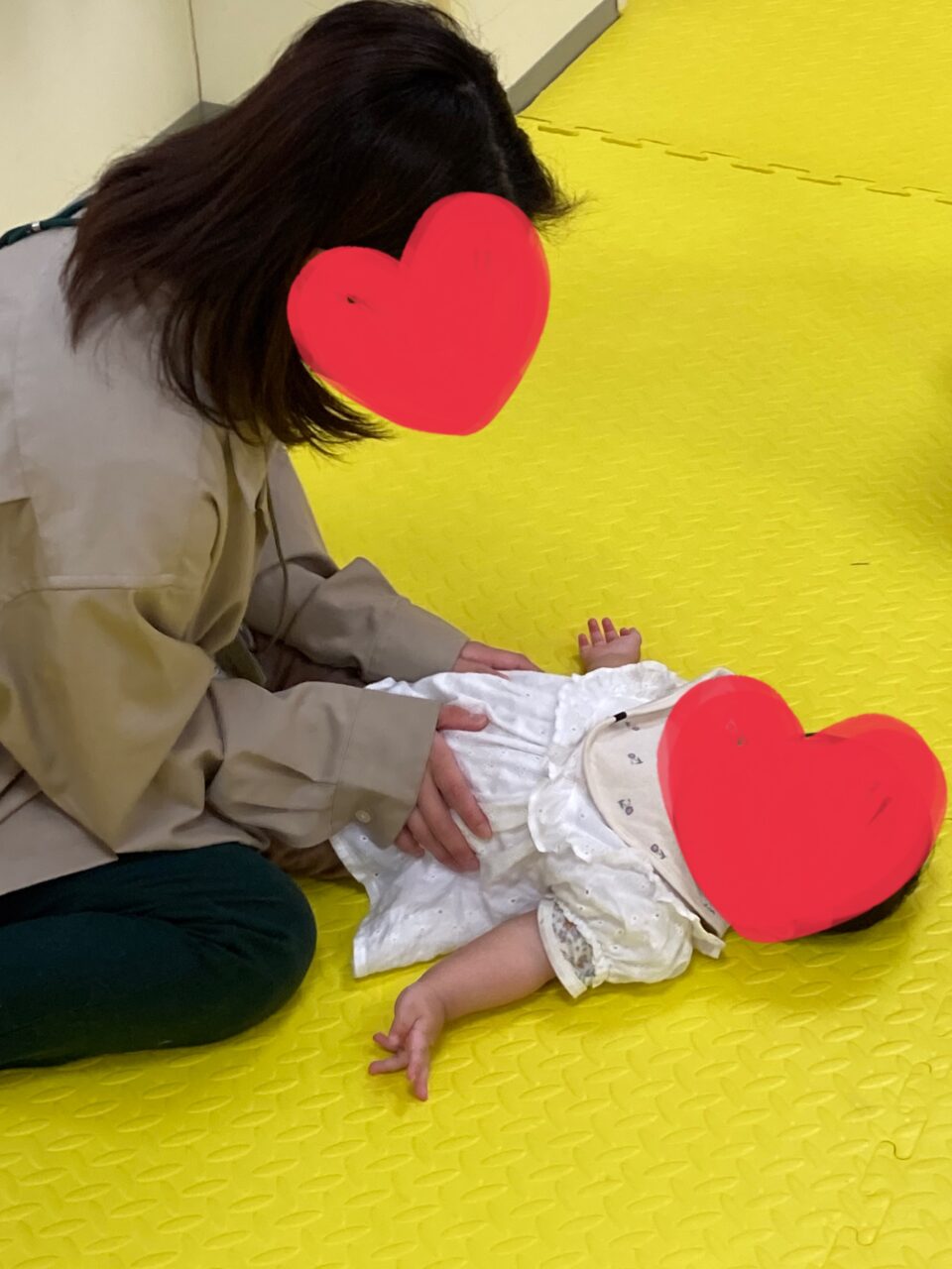 ふれあい遊びでは「りんご?コロコロ」「ラララ♪エプロン」の歌に合わせて、ママに触れられてまったりしたりと楽しんでいました?