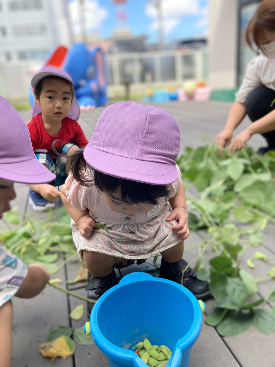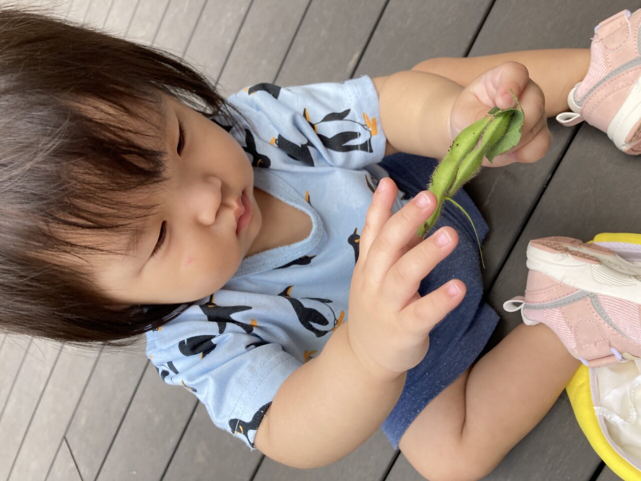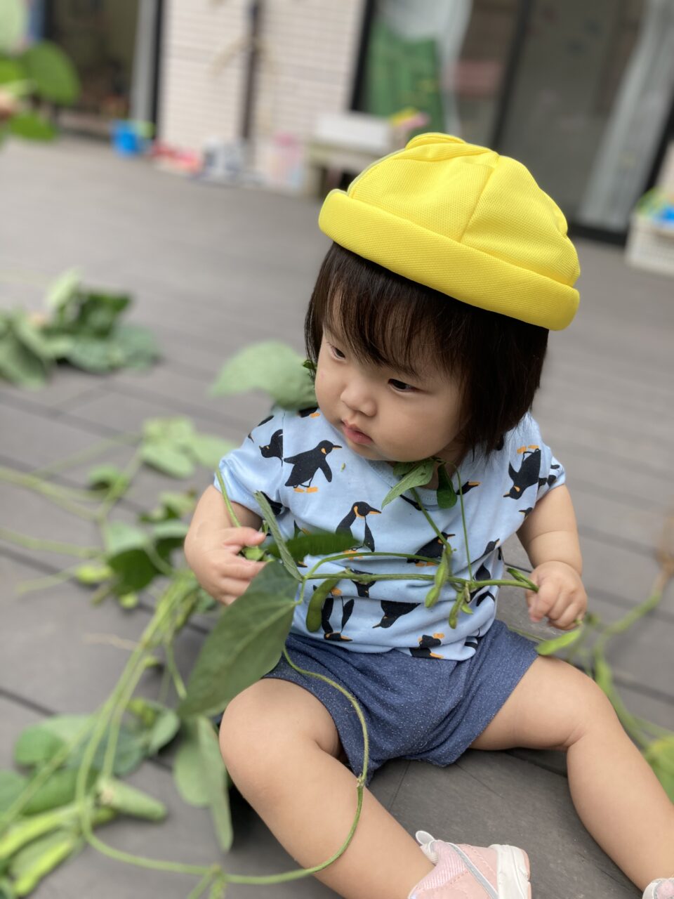 ひよこ組さんのHちゃんも枝豆の苗に興味津々で