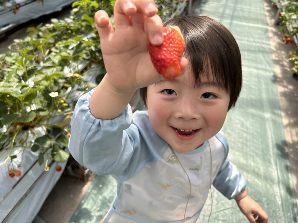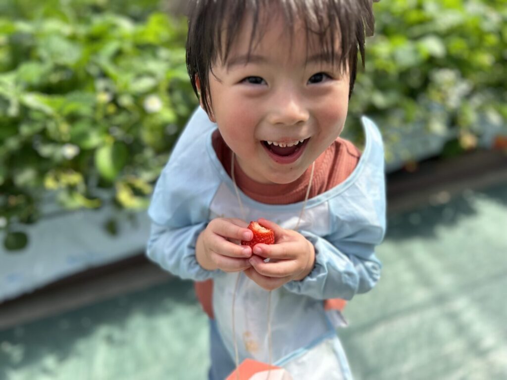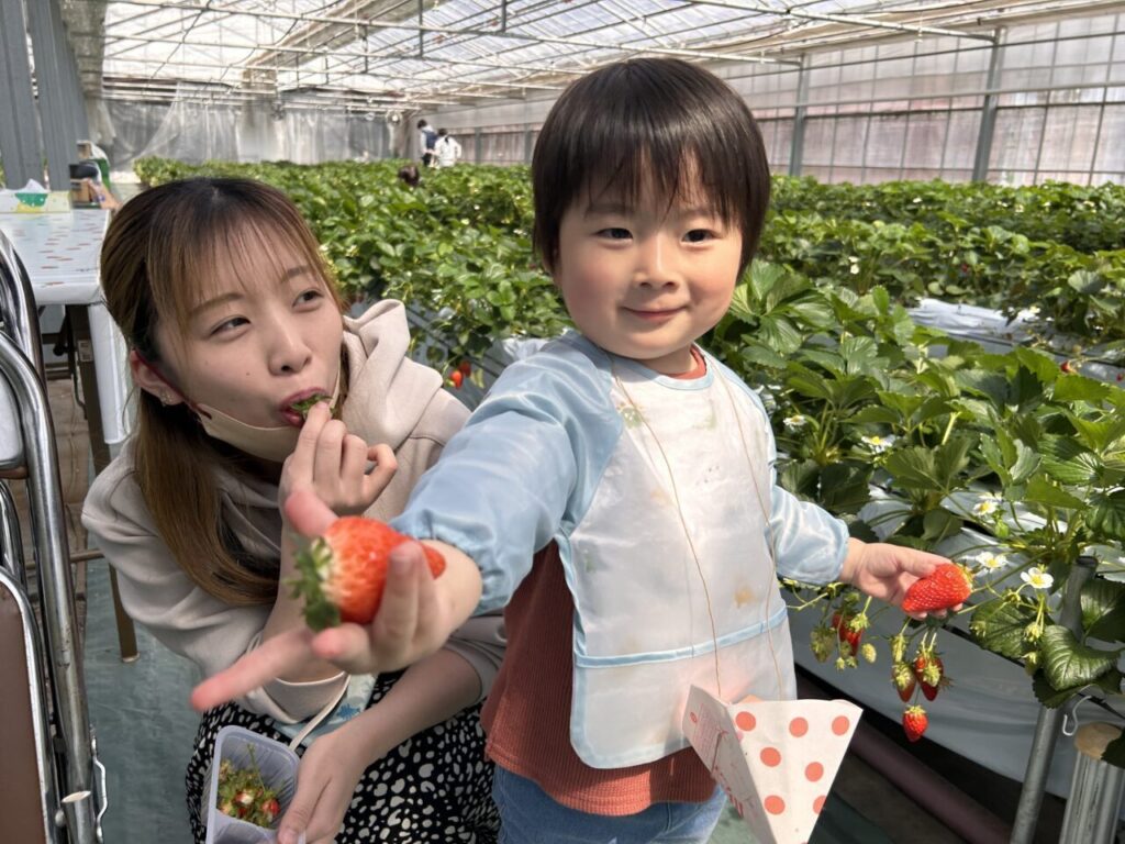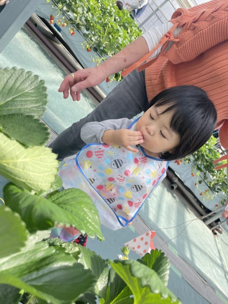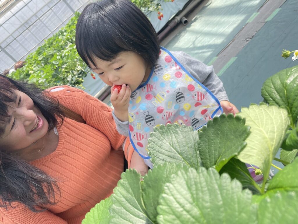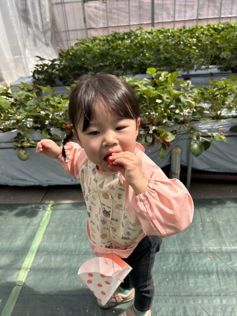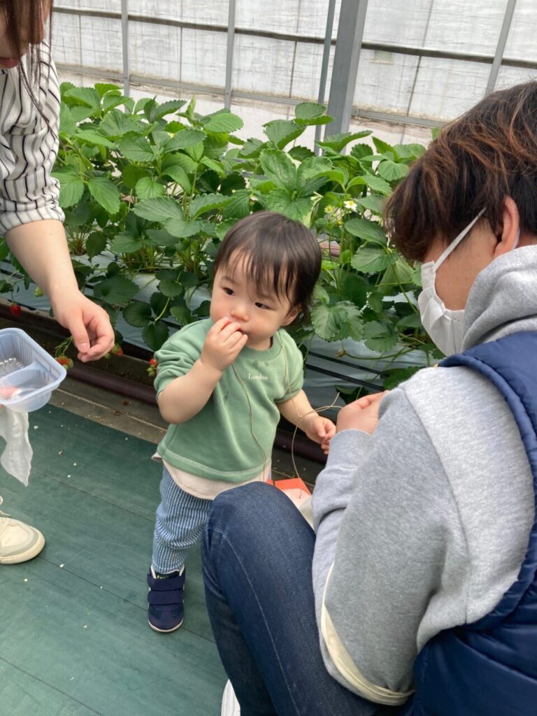 きらきら保育園としていちご狩りは初めての行事となりましたが、美味しそうに食べている子ども達の笑顔や、保護者の方々との微笑ましい姿も見ることができて、保育士一同、開催できてよかったなと感じています。