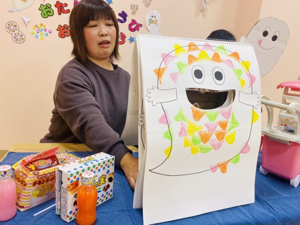 ばけおくんんがお菓子をむしゃむしゃ食べていると