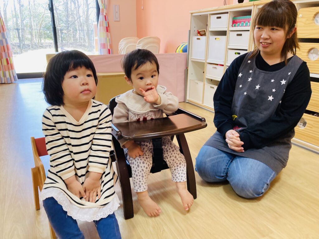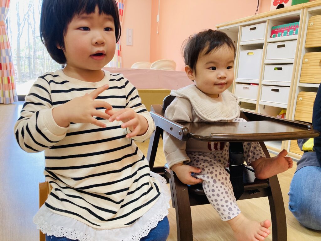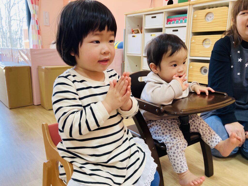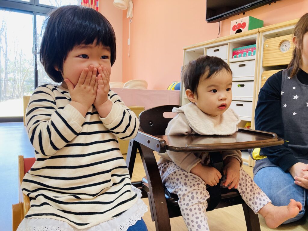 『まあるいたまご』の手遊びをして、