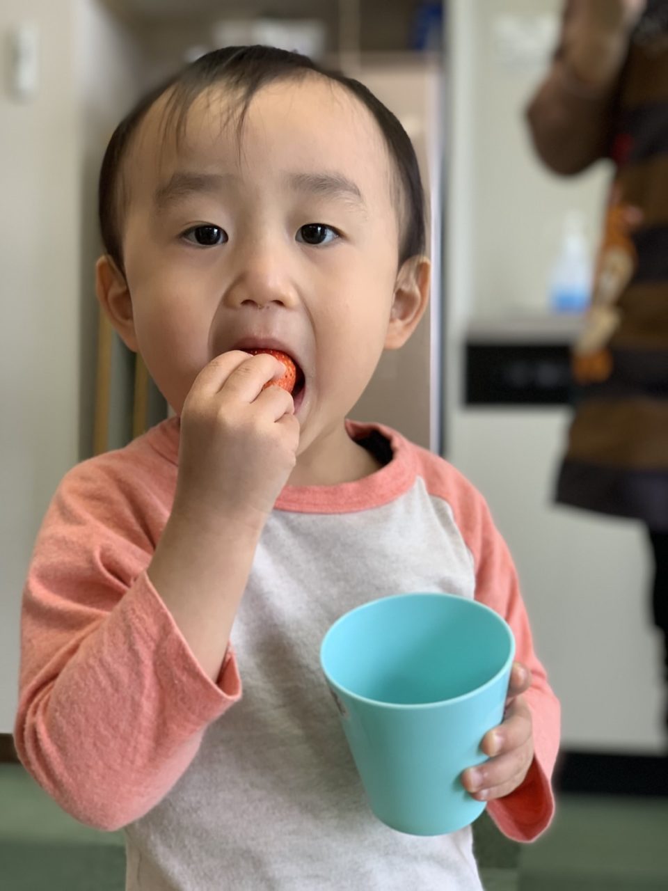 洗濯バサミにぶら下がっているいちごを上手に取って、大きな口でいちごを頬張っていましたよ!?