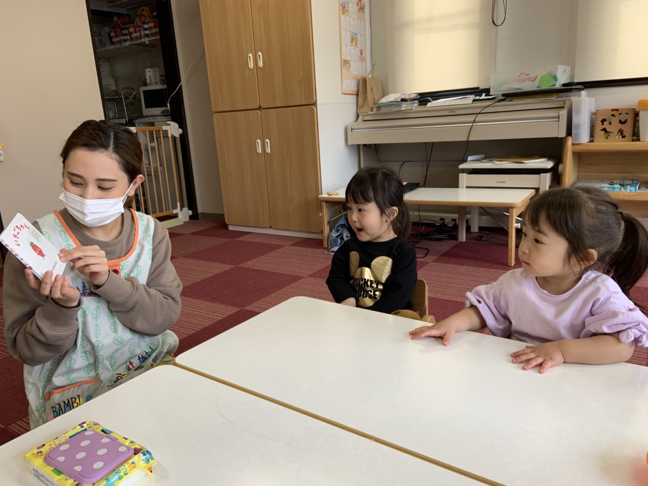 まずは、いちごちゃんという絵本を読み聞かせをしてからつき組さんに向かいます!?