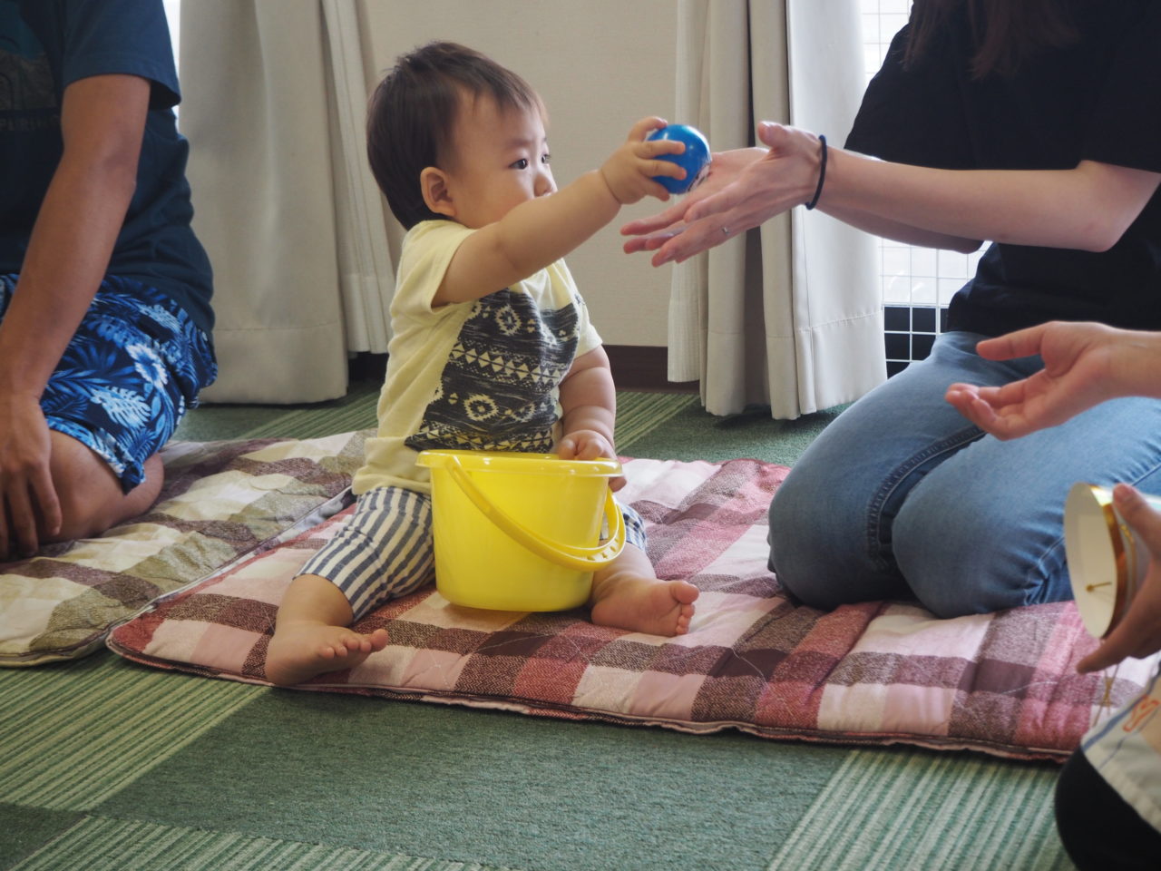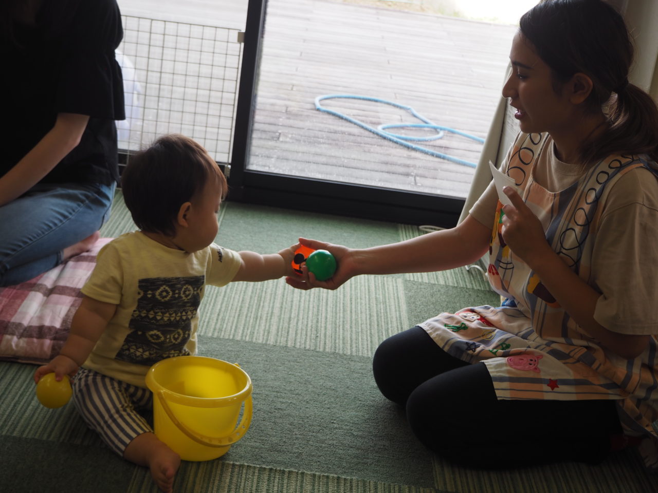 お父さんやお母さん、ほし組の先生に上手にボールを手渡すことが出来ると、