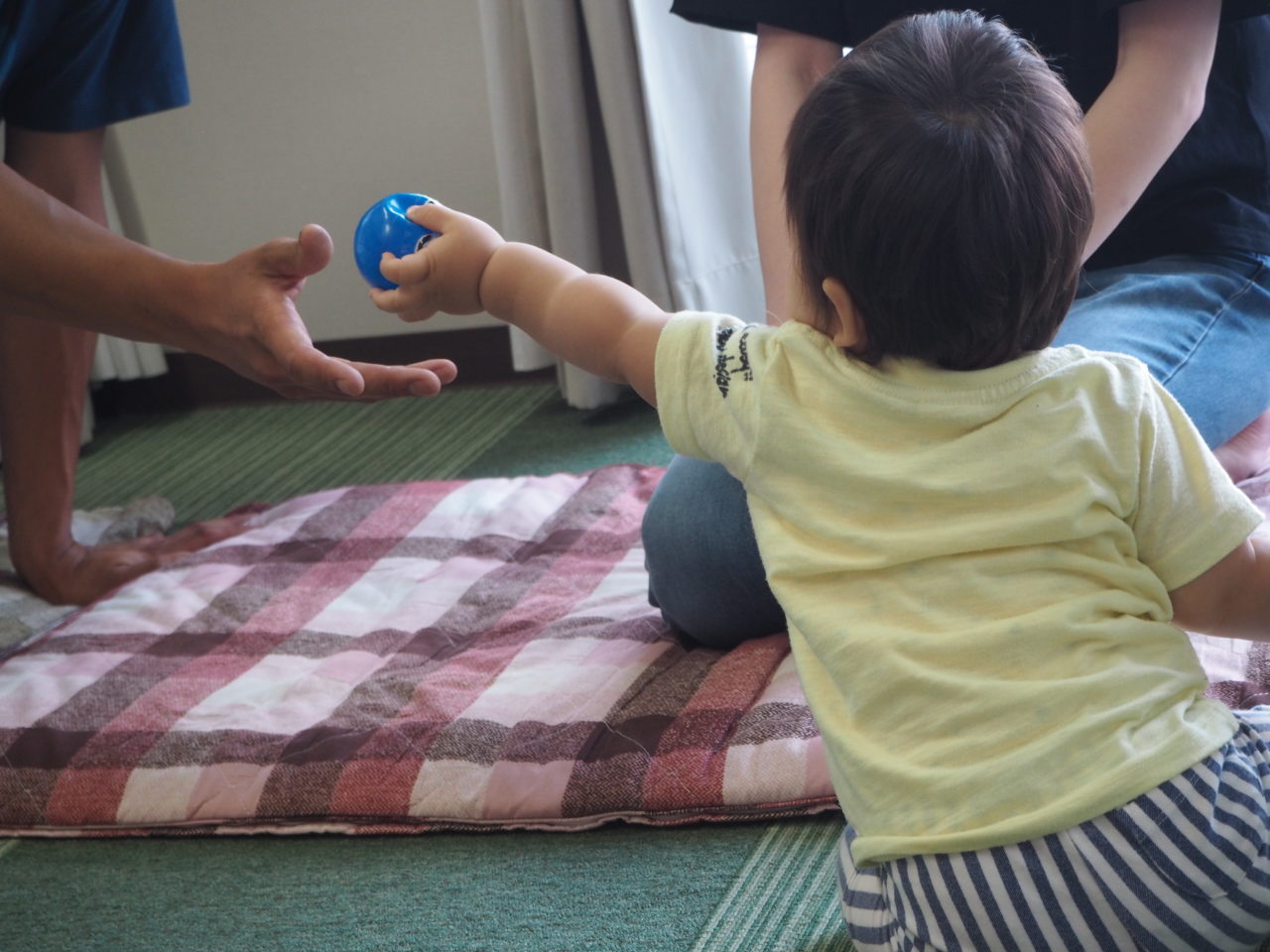 早速、ミッキーマウスがついたボールを手渡すゲームがスタートです?