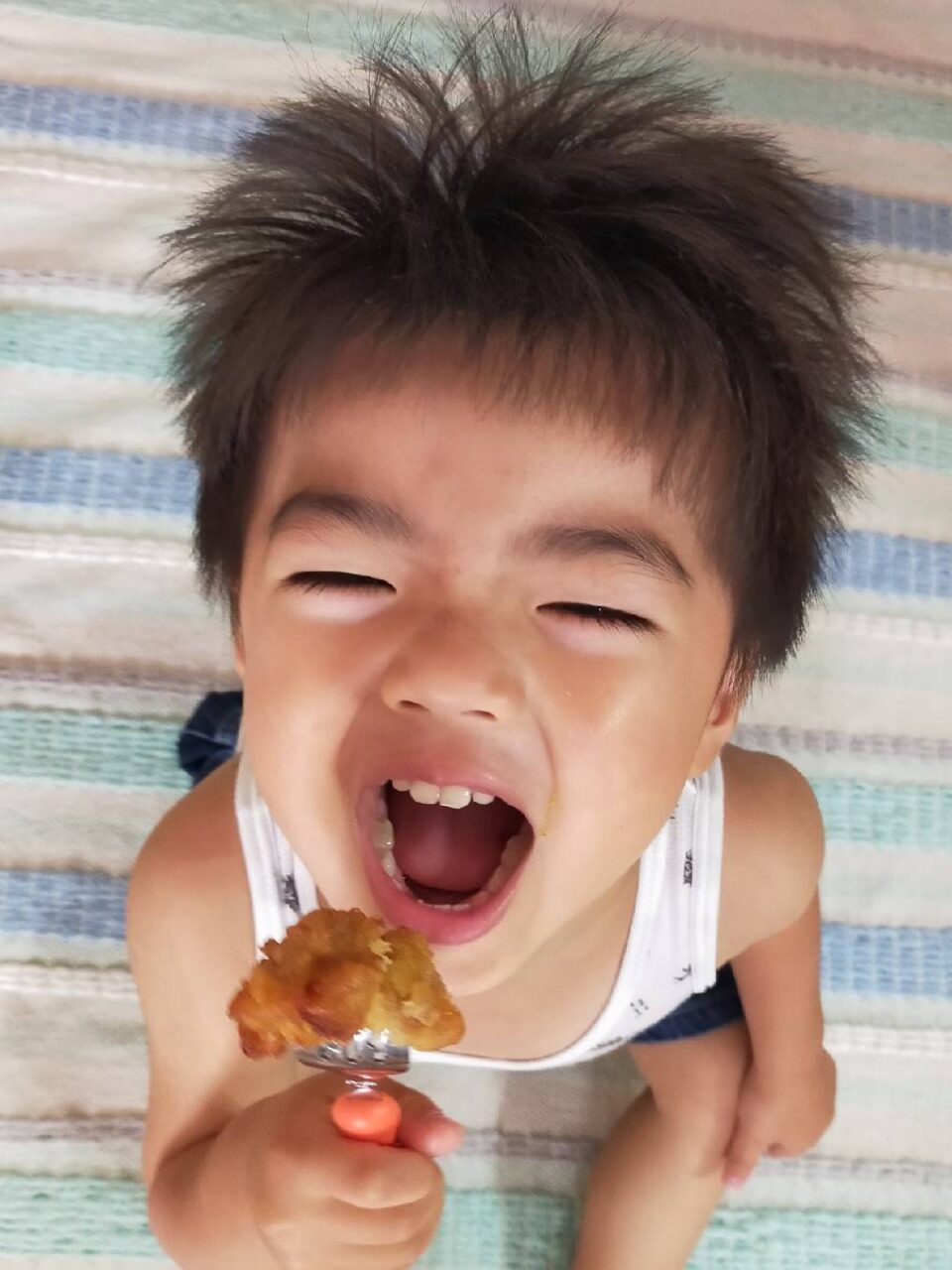 揚げたての唐揚げを手にしたきらきらっ子のにやけた😄お顔から、嬉しさが伝わってきます‼️😃