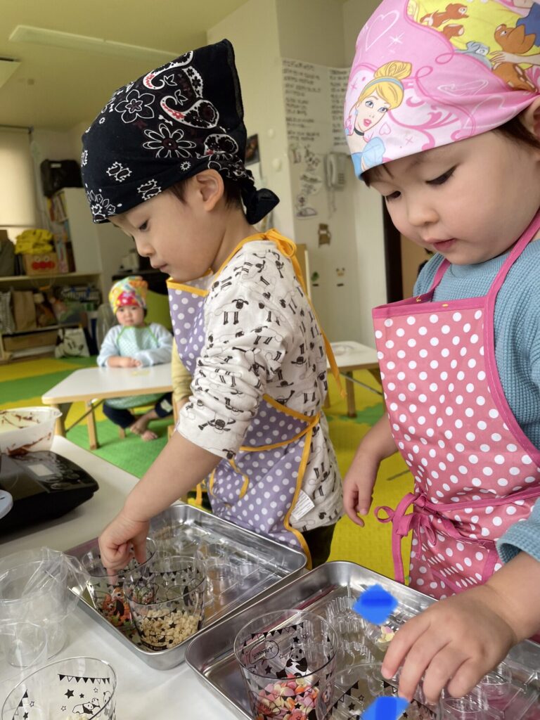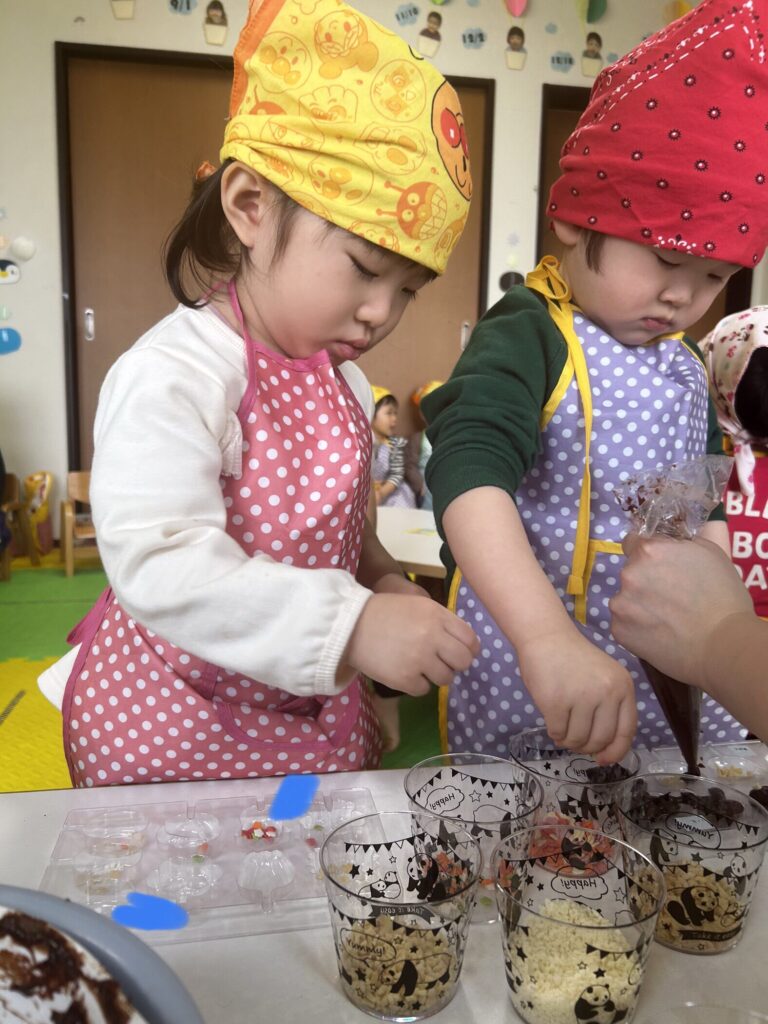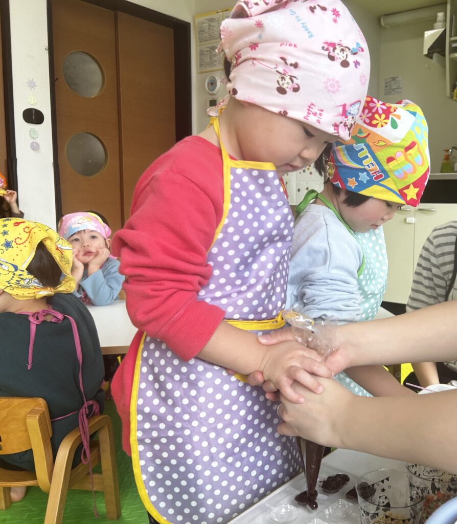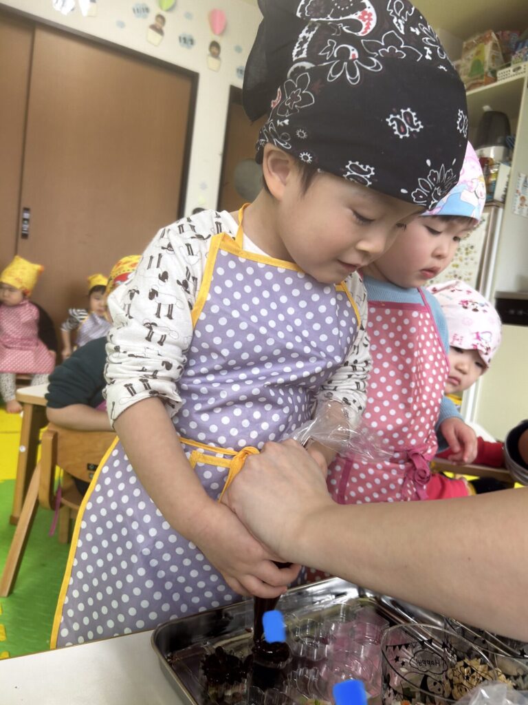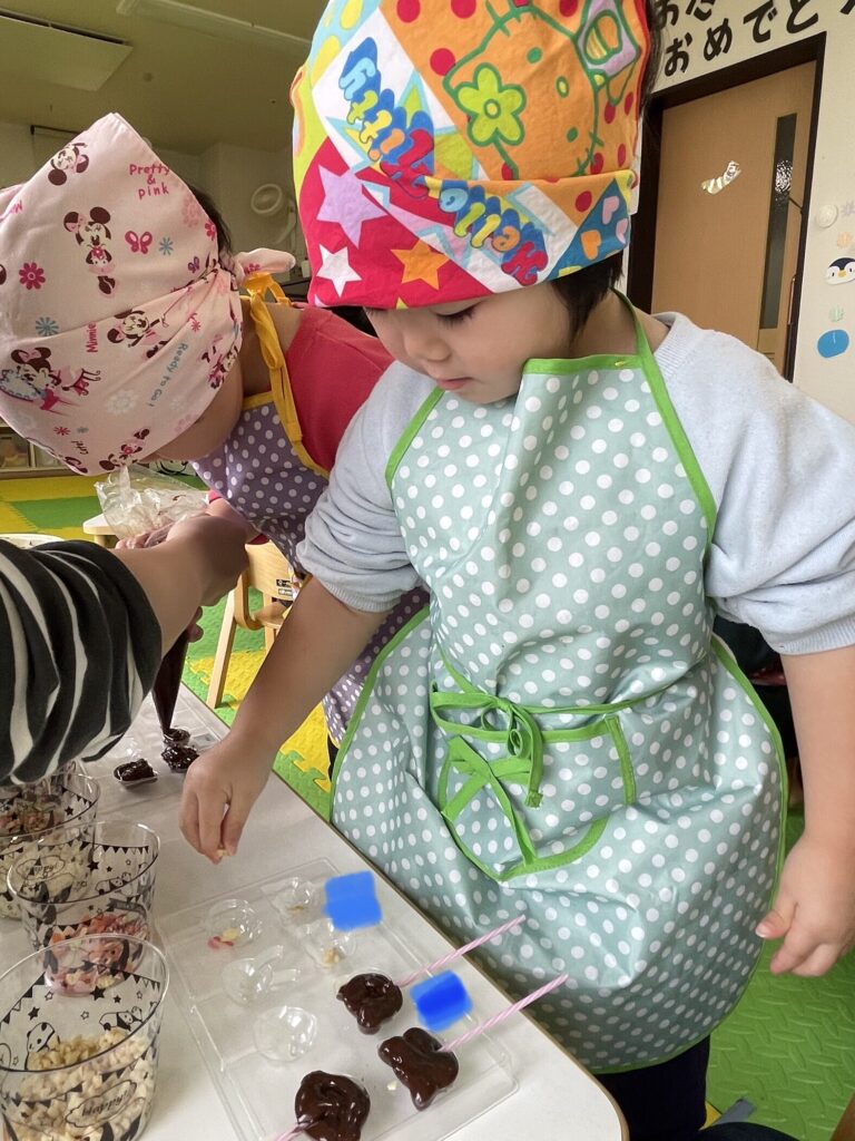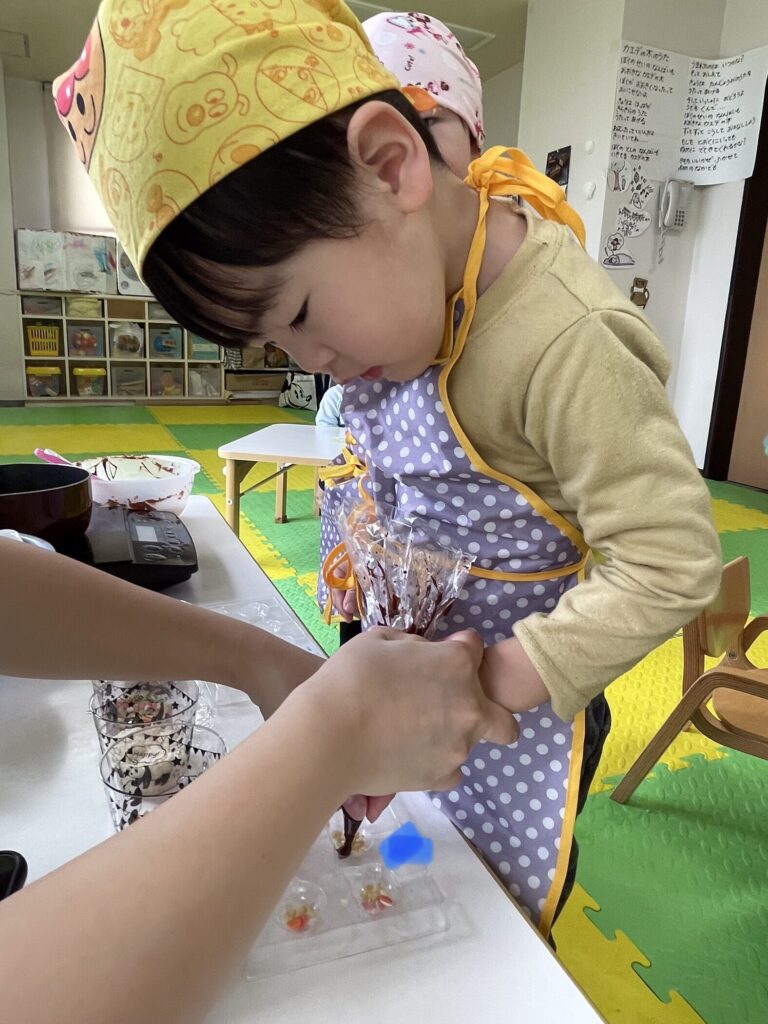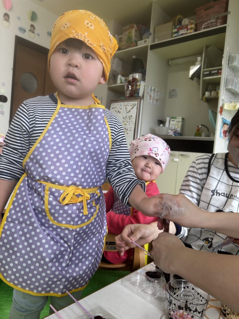 できた、チョコレートは午後のおやつとお家に持ち帰りましたよ?