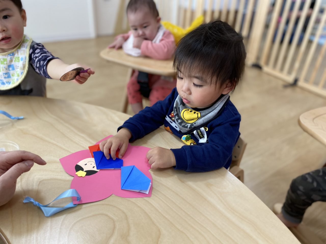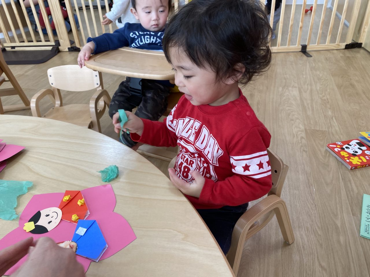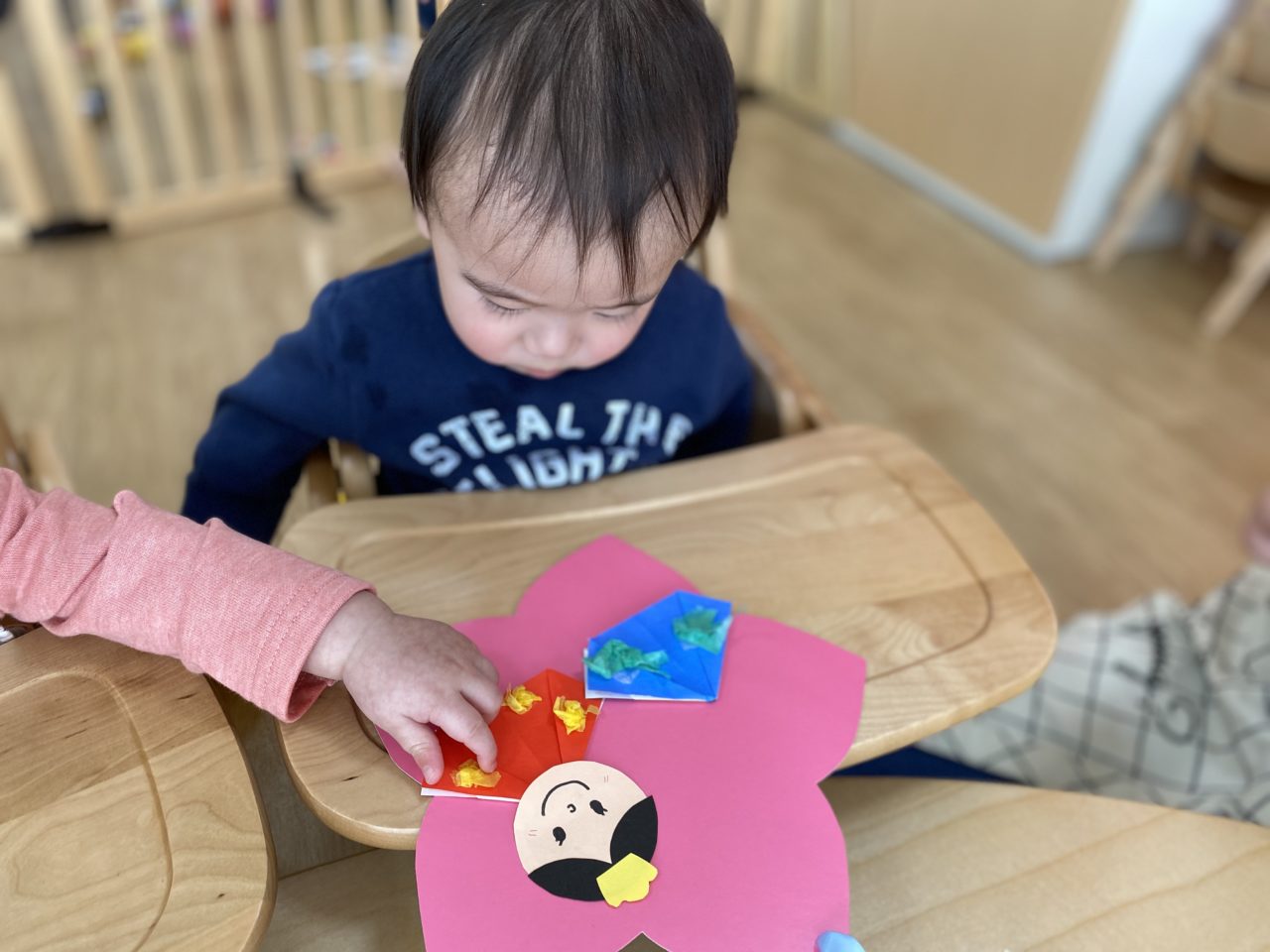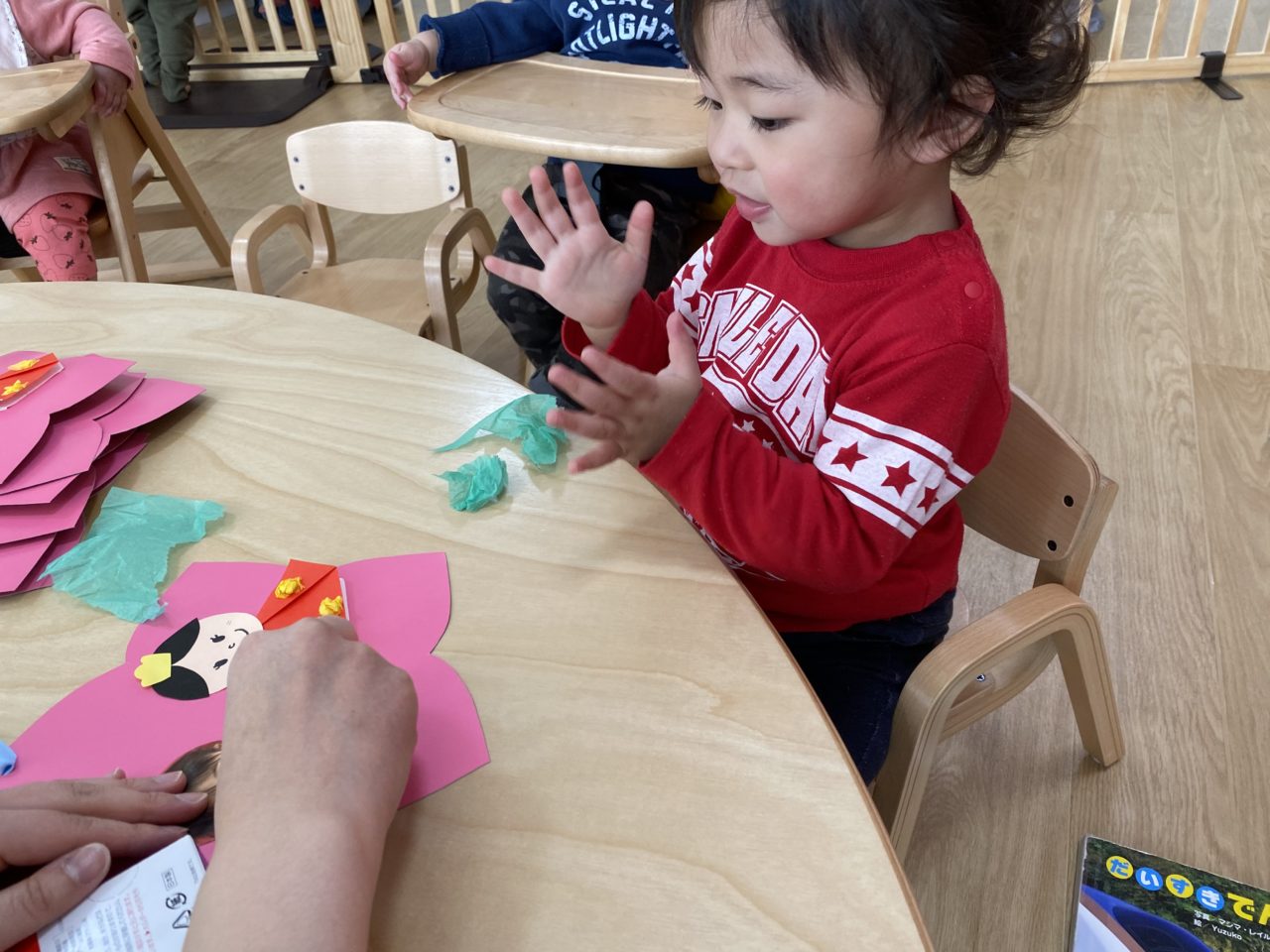 小さいクラスのほし組さんはお花紙を丸めて着物に貼りました⭐️