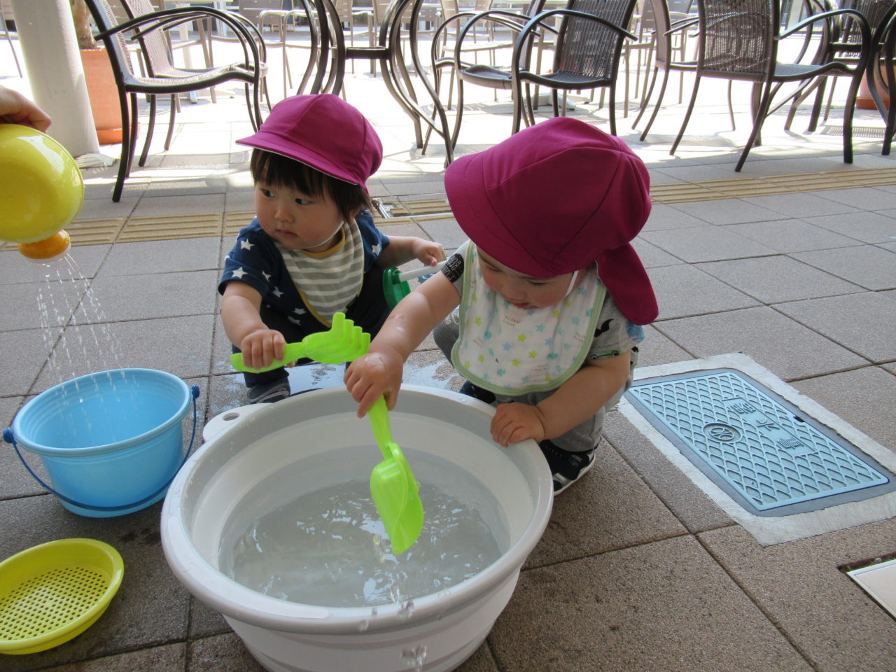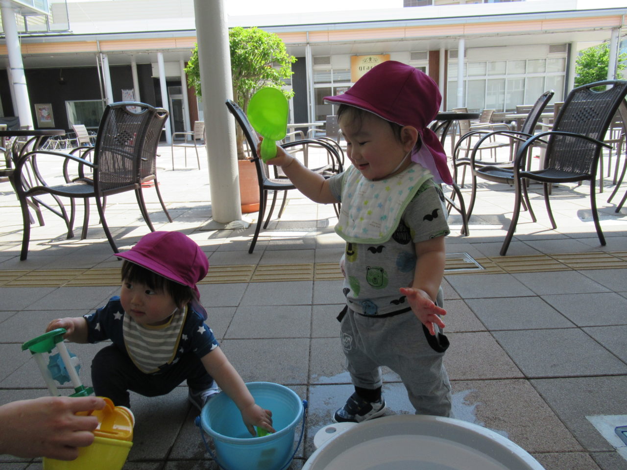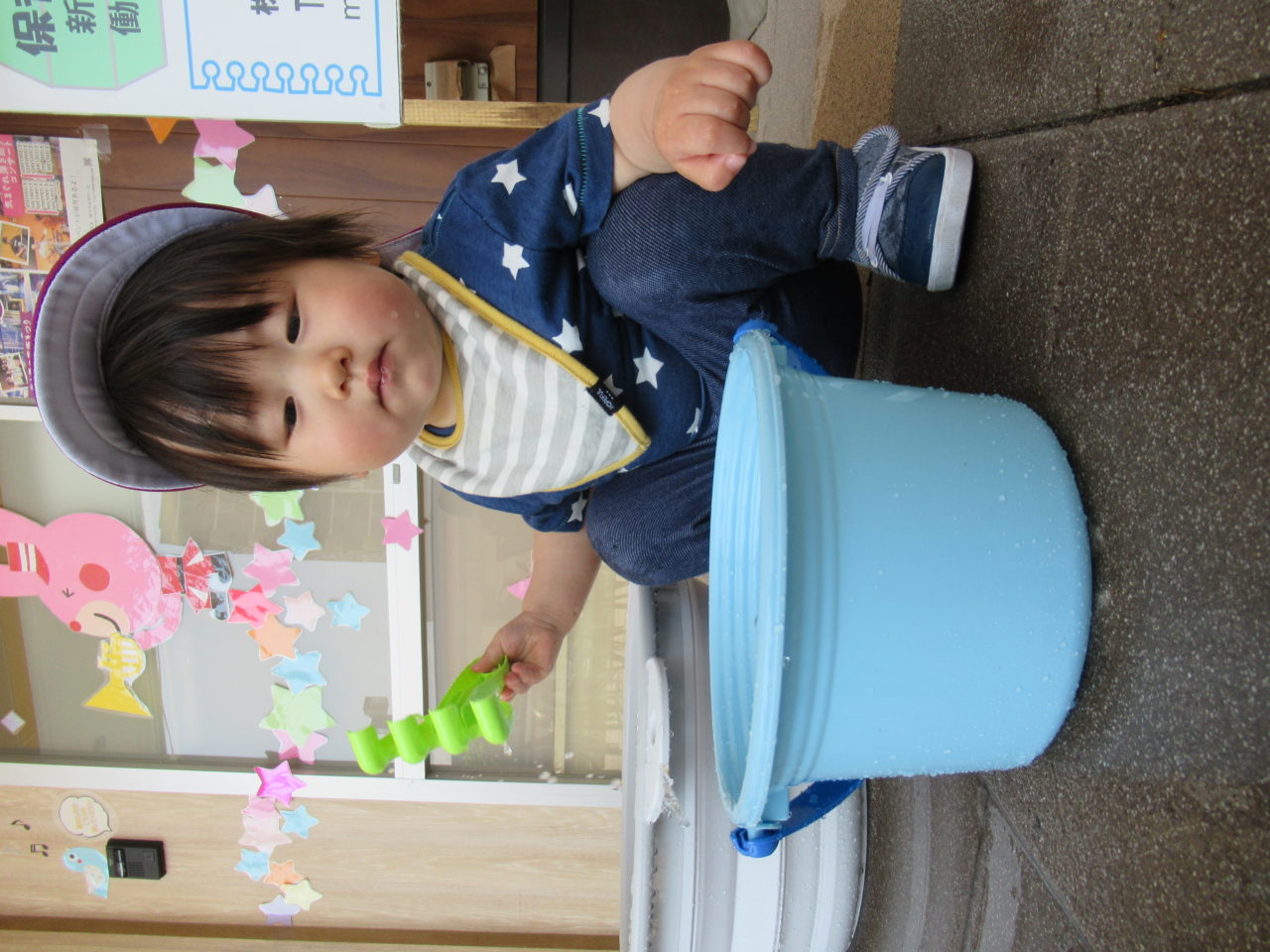 今週末は園の前で水遊びを楽しんでいる子どもたちです?