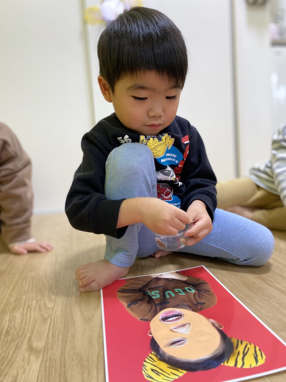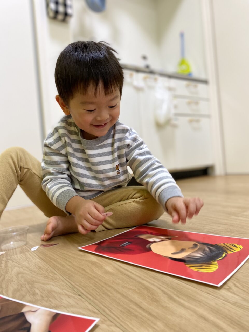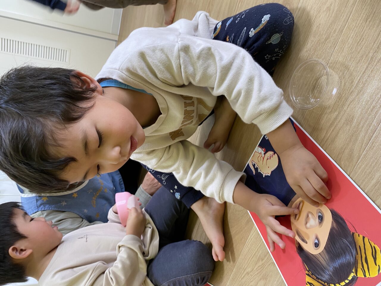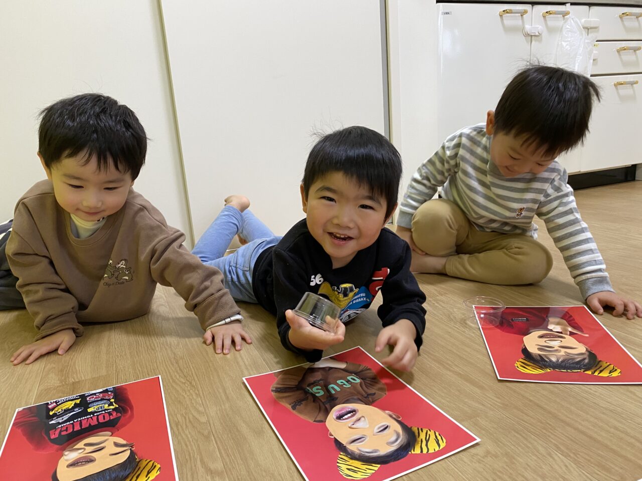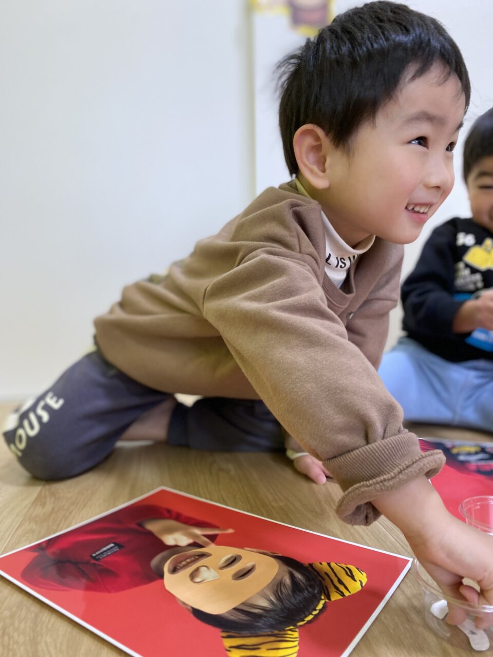 配置によって全く違う顔になるのがおもしろかったようでHくんはどハマり‼︎笑いのツボにも入ってしまったようでした🤣🤣また、お友だちの福笑いと交換となると必ず、Sくんの福笑いを選んでいました😍♡