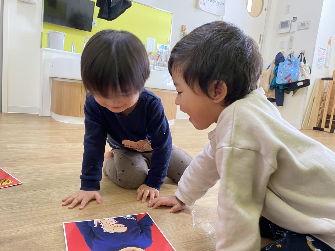 自分やお友だちの顔に大笑いしたり、顔のパーツをわざと別の場所に置いたりといろいろな遊び方で楽しんでいたつき組の福笑いでした(*^^*)?