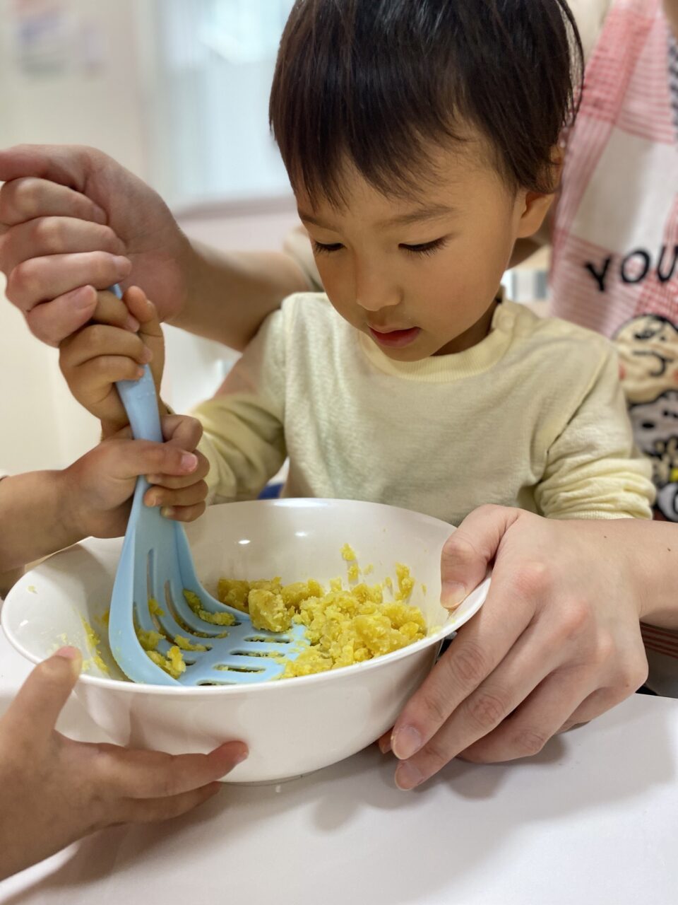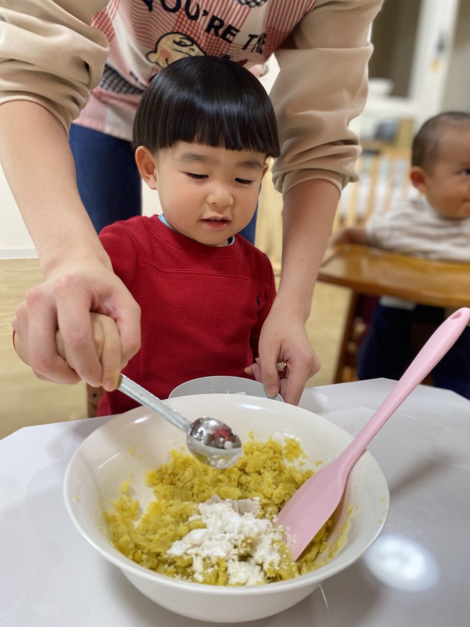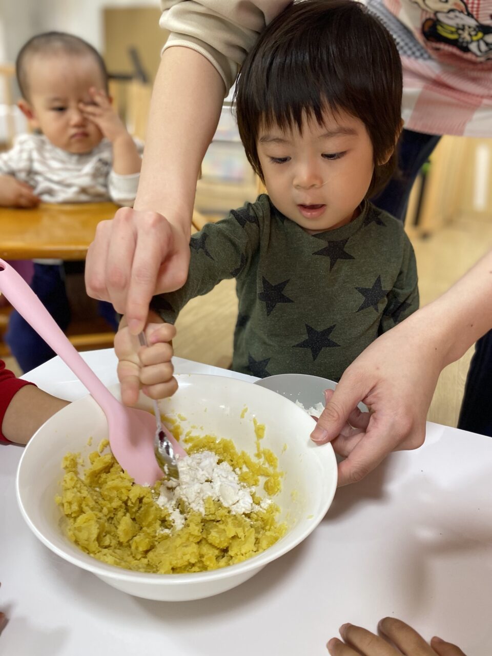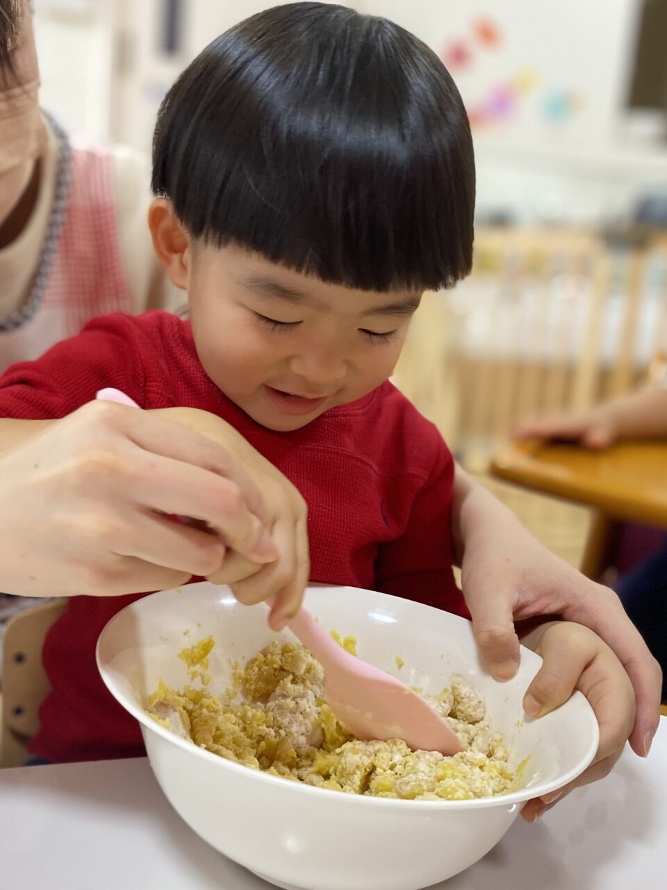 保育士が切るように混ぜていたのよーく見ていたつき組のお兄さんたち!
