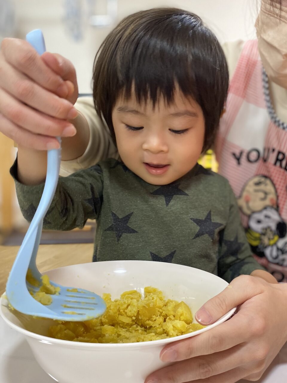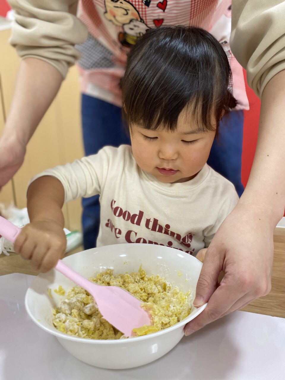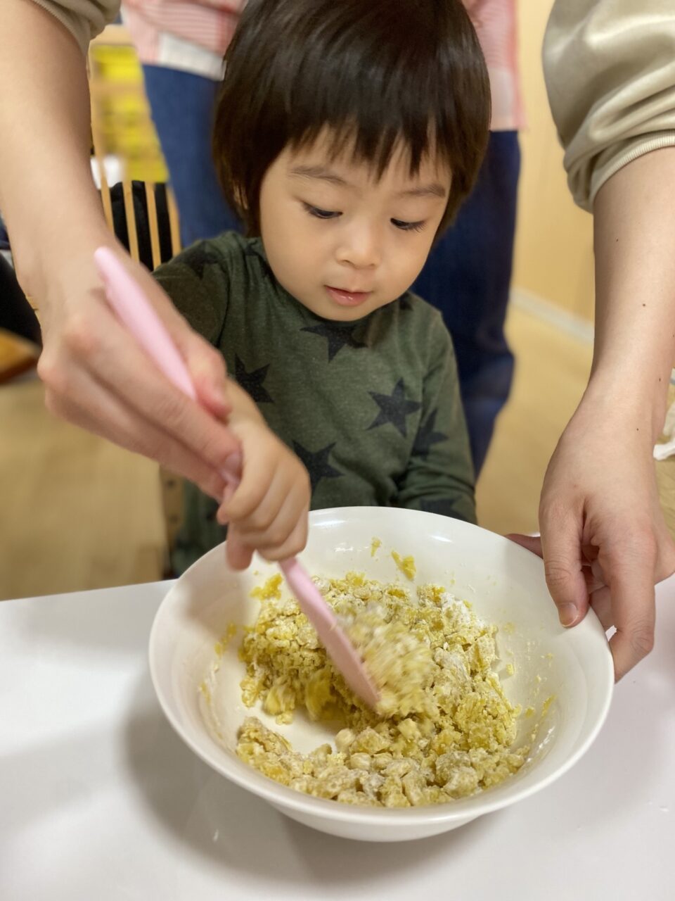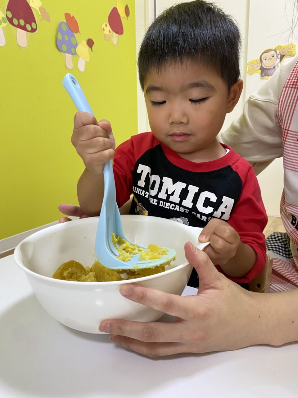 保育士が切るように混ぜていたのよーく見ていたつき組のお兄さんたち!