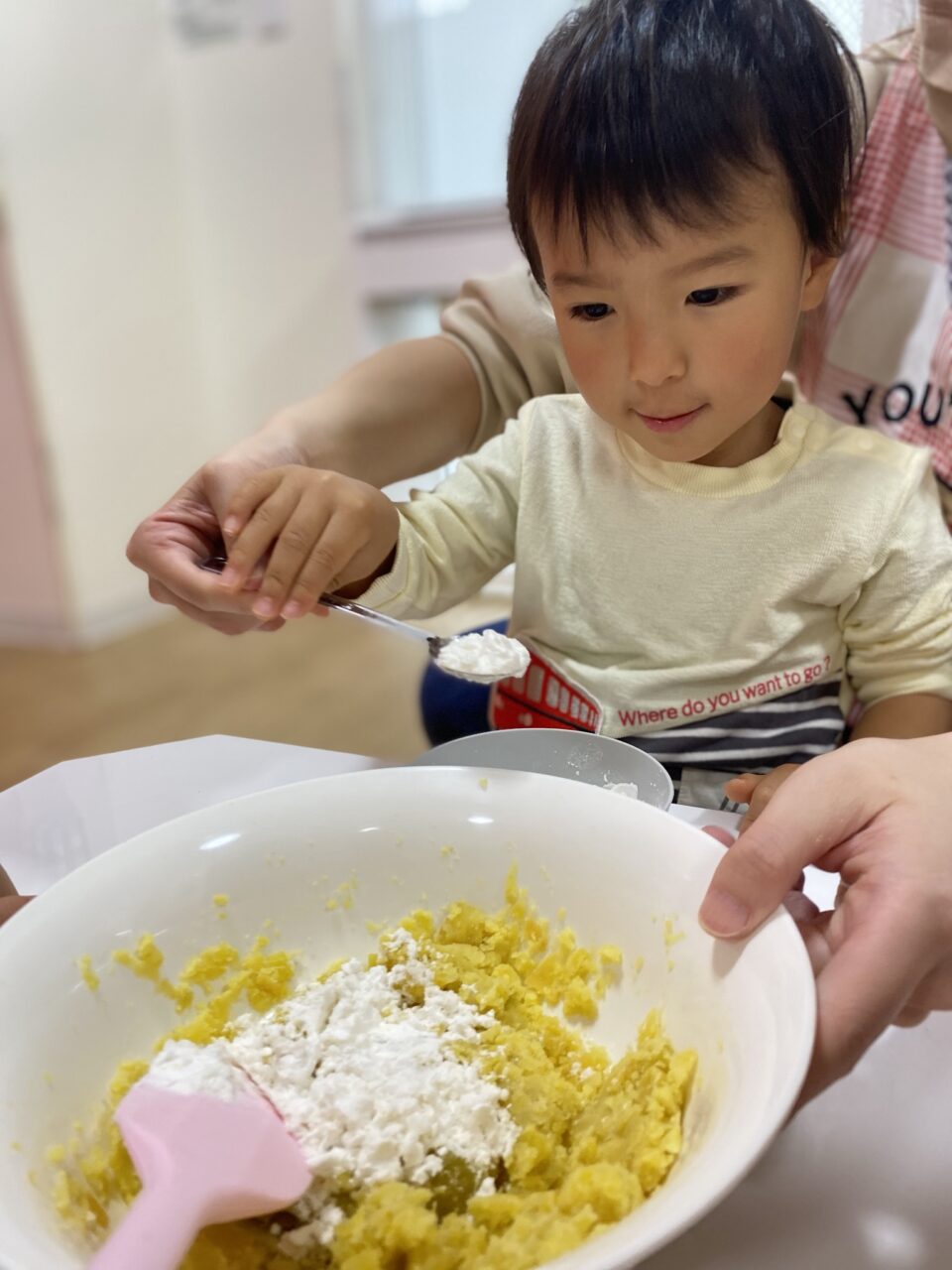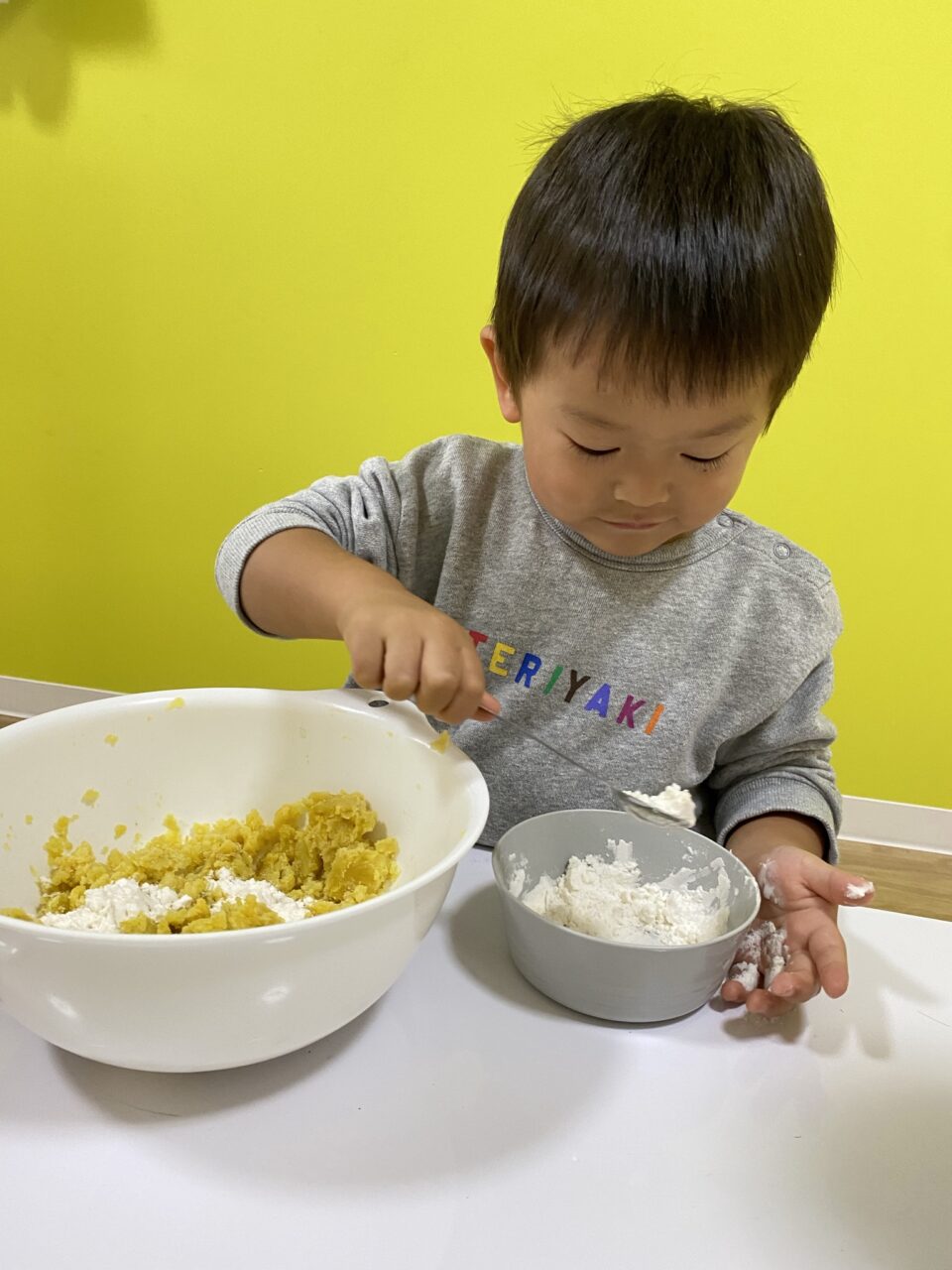 よく潰したさつまいもに、片栗粉・牛乳・きな粉・ごまを入れ、混ぜていきます!