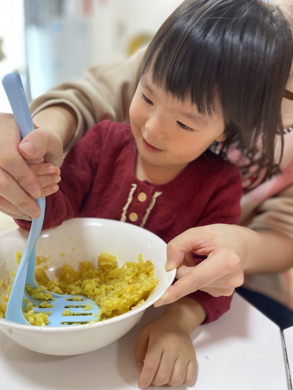 まず初めに、皮を剥いて蒸して柔らかくしたさつまいもを潰していきます!