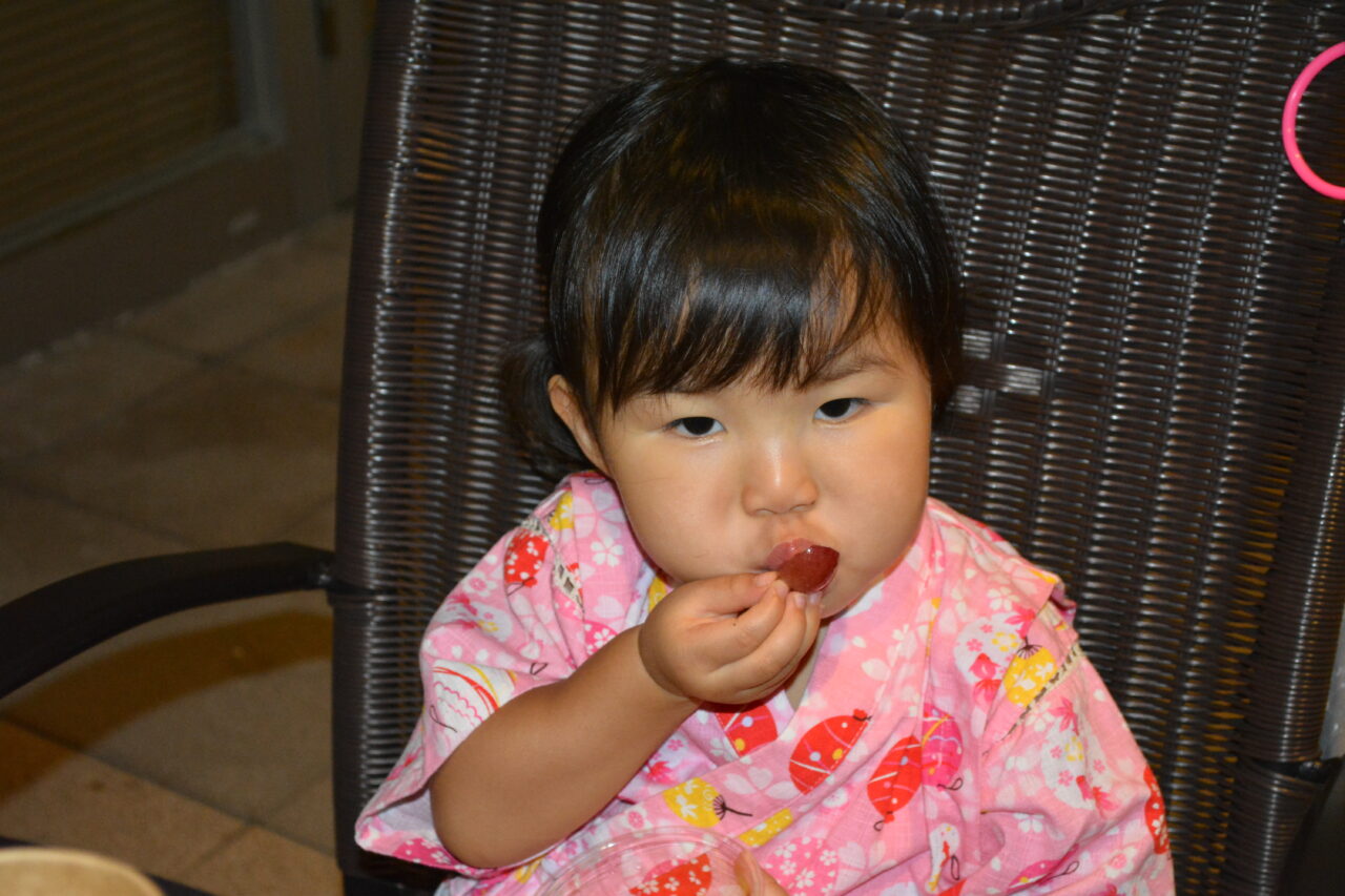 甚平を着て、お家の方とゲームや食事を楽しむ子ども達?