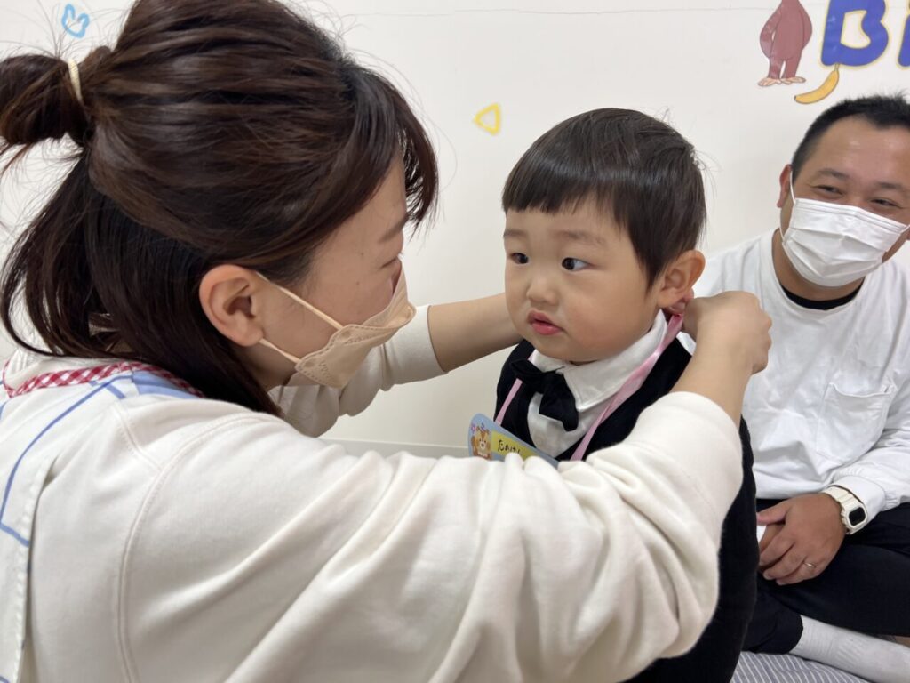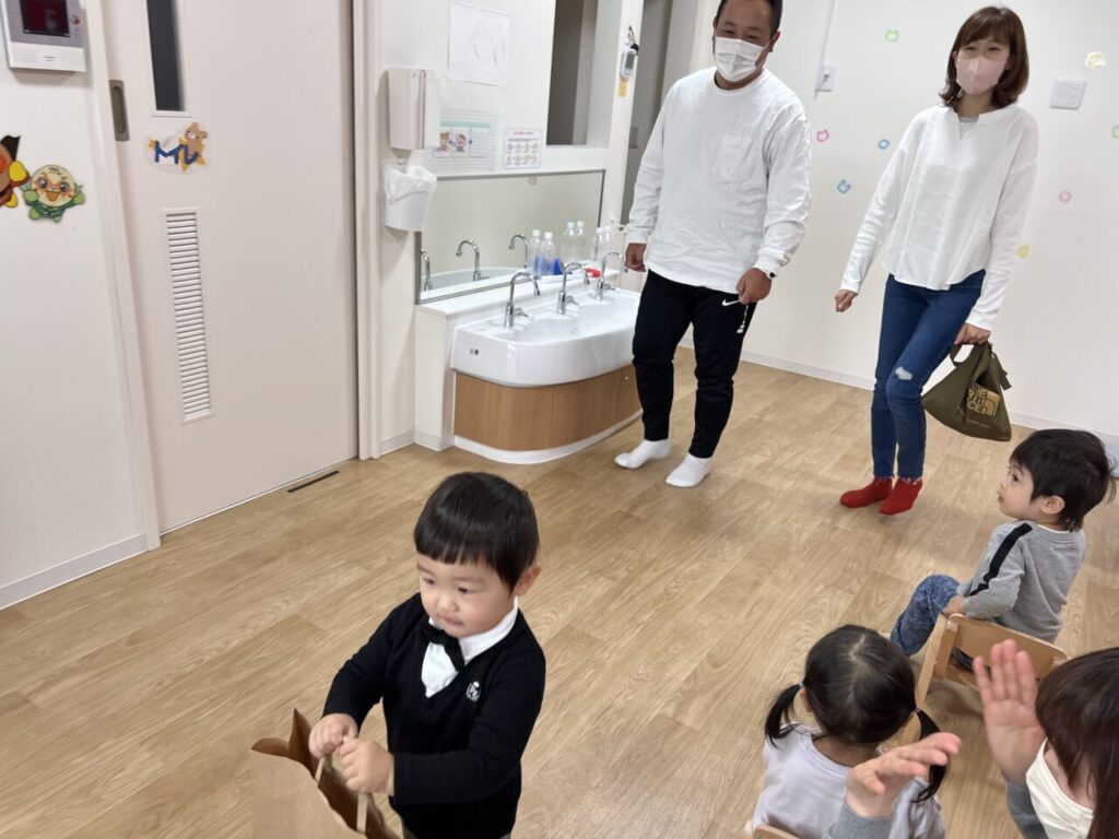 ビシッとオシャレをして、お父さんお母さんと登園したSくん?