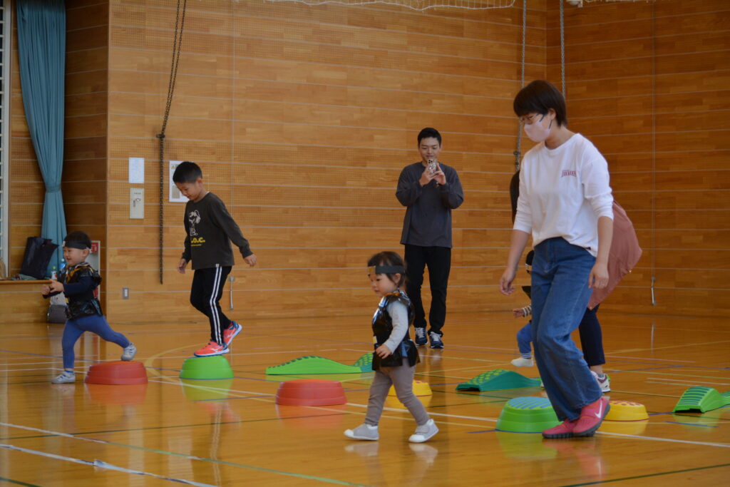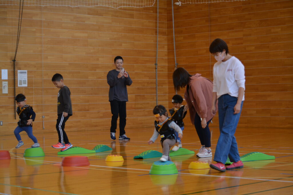 最初は形の異なるバランスブロックの上を渡るでござる?